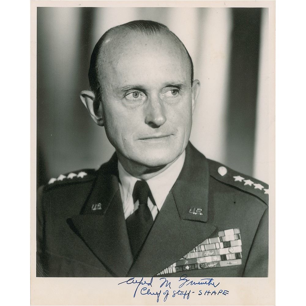 Vintage matte-finish 8 x 10 photo of Gruenther in uniform, signed in the lower border in fountain pen, "Alfred M. Guenther, Chief of Staff - SHAPE." Reverse bears a SHAPE credit stamp. In fine condition, with a few light bends.