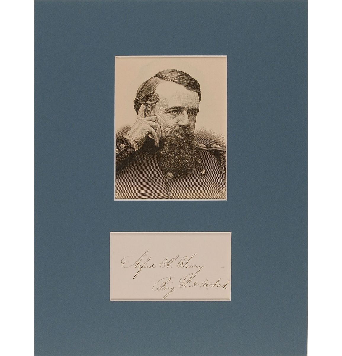 Ink signature, “Alfred H. Terry, Brig. Genl. U. S. A.,” on an off-white 3.5 x 2 card. Matted with an illustration of Terry to an overall size of 8.25 x 10.75. In fine condition, with a couple trivial surface marks.