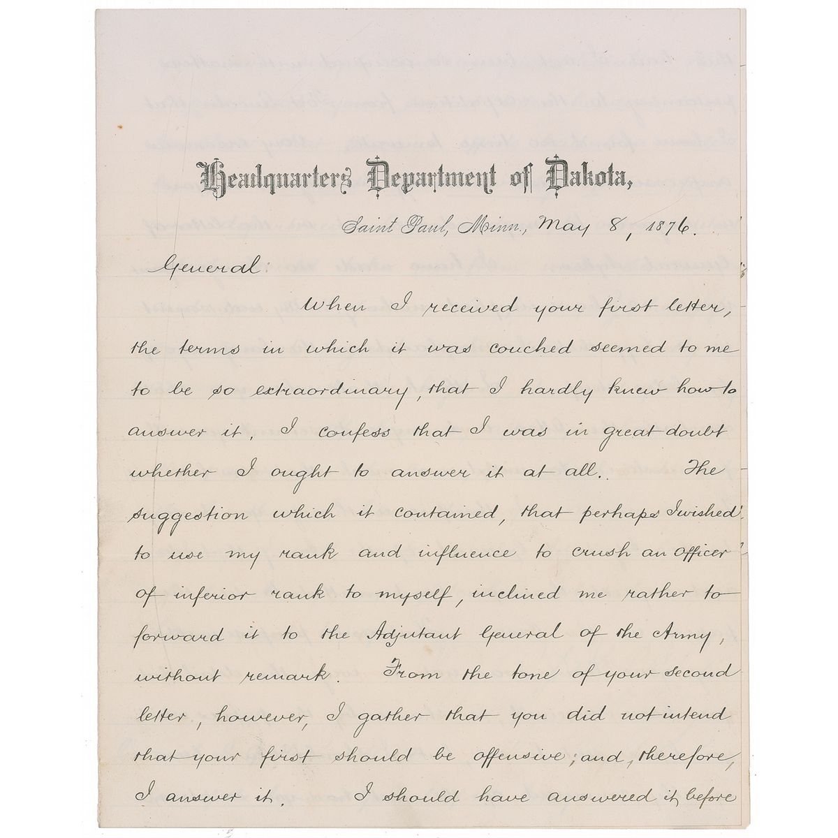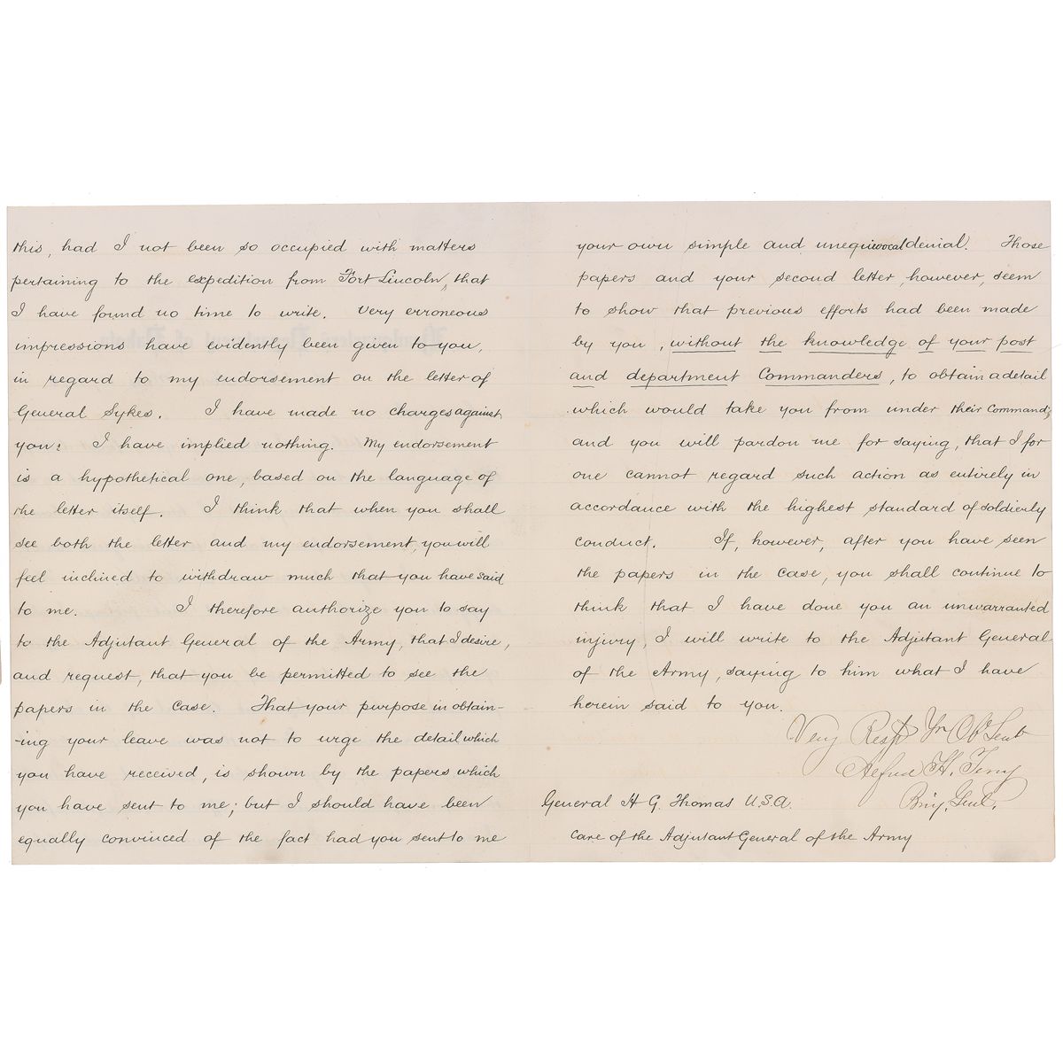 Union general (1827–1890) who fought at First Bull Run and Port Royale, and who, after the war, became commander of the expedition against the Sioux during which Custer met his end at Little Bighorn. LS signed “Alfred H. Terry, Brig. Genl.,” three pages on two adjoining sheets, 7.5 x 9.5, Headquarters, Department of Dakota letterhead, May 8, 1876. Letter to General H. G. Thomas. In part: “When I received your first letter…I confess that I was in great doubt whether to answer it at all. The suggestion which it contained, that perhaps I wished to use my rank and influence to crush an officer of inferior rank to myself, inclined me rather to forward it to the Adjutant General…From the tone of your second letter, however, I gather that you did not intend that your first should be offensive; and therefore I answer it…Had I not been so occupied pertaining to the Expedition from Fort Lincoln that I have had no time to write. That your purpose in obtaining your leave was not to urge the detail which you have received is shown by the papers which you have sent to me, seem to show that previous efforts have been made by you, without knowledge of your post and department commanders to obtain a detail which would take you from under their command and you will pardon me for saying, that I for one cannot regard such action as entirely in accordance with the highest standard of soldierly conduct.” In fine condition, with a couple of small separations to one horizontal mailing fold. On May 17, 1876, General Terry started from Fort Lincoln with four companies, totaling 925 men. The expedition would culminate in one of the most storied military events in American history—Little Big Horn.
