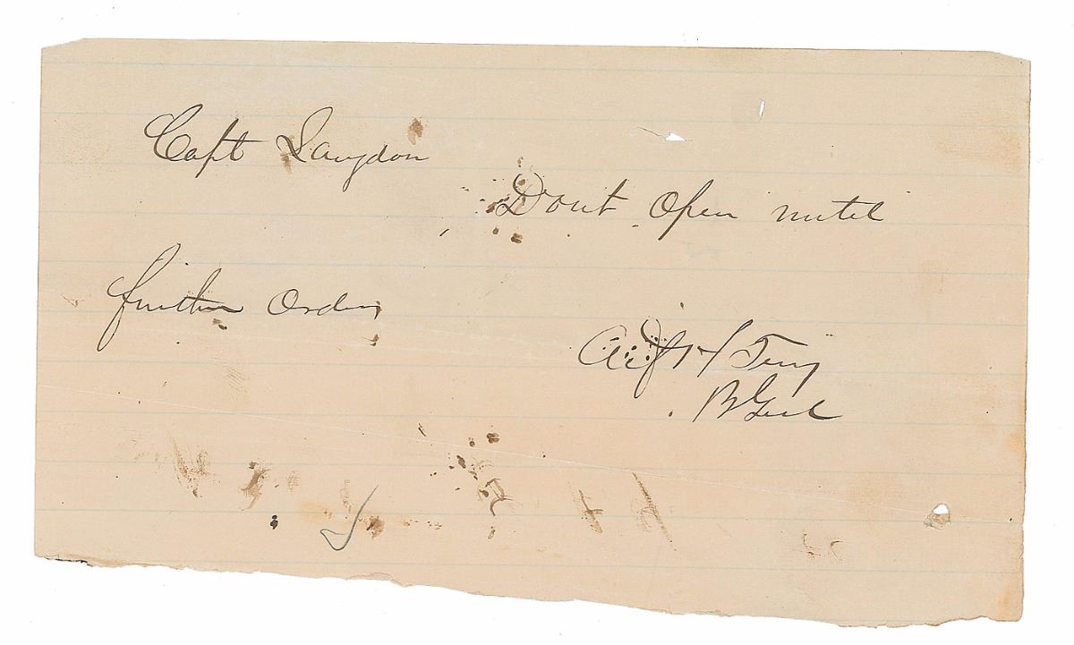 Union general (1827–1890) who fought at First Bull Run and Port Royale, and who, after the war, became commander of the expedition against the Sioux during which Custer met his end at Little Bighorn. ANS signed “Alfd. H. Terry, B. Genl,” one page, 7.5 x 4.5, no date. Presumed battlefield note hastily dashed off to Captain Loomis L. Langdon. In full: “Don’t open until further orders.” Moderate creases, toning, a few small holes, mirroring of ink, and several stray ink marks, otherwise fine condition.