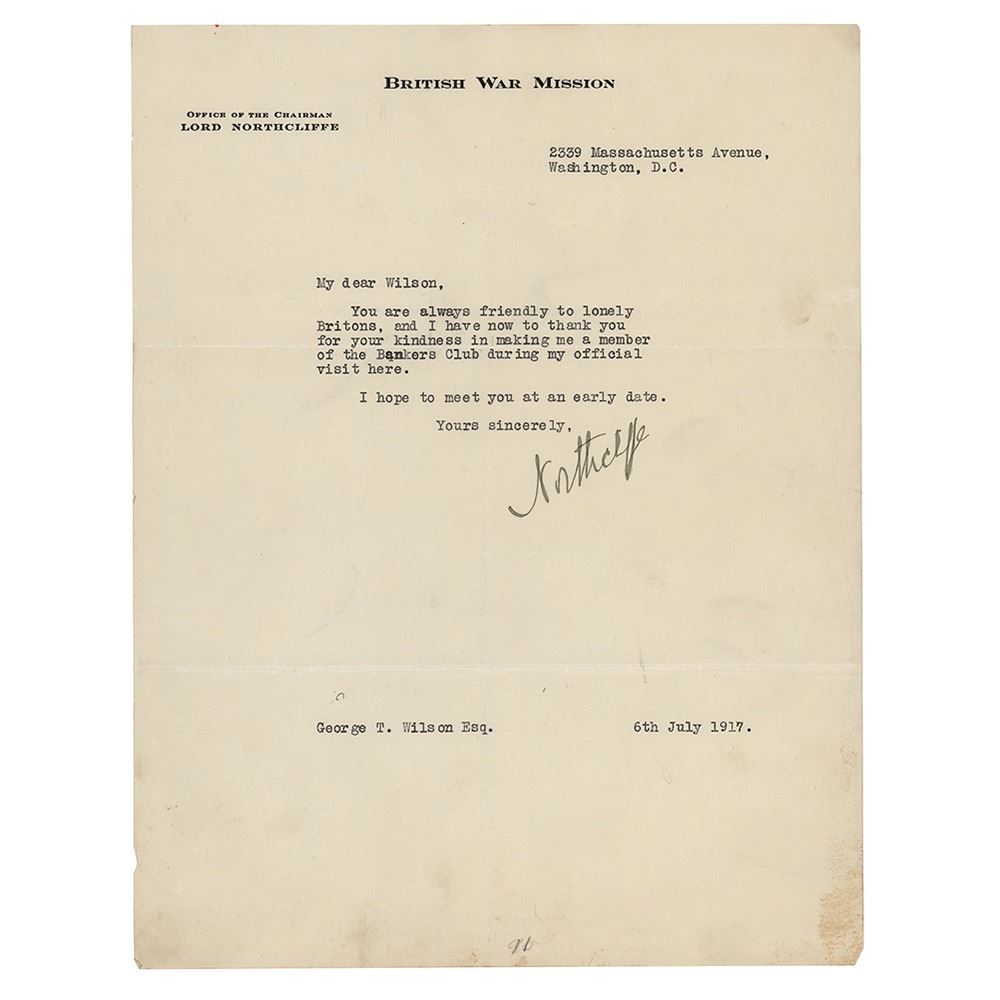 British newspaper and publishing magnate (1865"“1922) who, as owner of the Daily Mail and the Daily Mirror, was an early developer of popular journalism, and he exercised vast influence over British popular opinion during the Edwardian era. World War I-dated TLS signed "Northcliffe," one page, 8.5 x 11, personal British War Mission letterhead, July 6, 1917. Letter to George T. Wilson, in full: "You are always friendly to lonely Britons, and I have now to thank you for your kindness in making me a member of the Bankers Club during my official visit here. I hope to meet you at an early date." In fine condition, with some light soiling to the lower blank area.