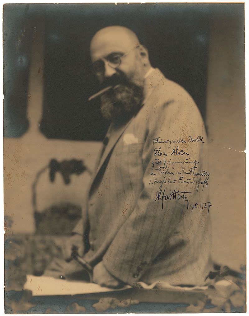 German conductor (1872–1942) best known as the director of the San Francisco Symphony. Oversized matte-finish 10.5 x 13.5 photo of Hertz with a cigar clenched in his teeth, signed and inscribed in fountain pen, in German and signed “Alfred Hertz, Sept. 1927.” In very good condition, with trimmed edges, a horizontal tear to right edge, scattered silvering to darker areas of background, and some foxing to left edge.