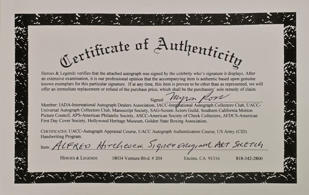 Alfred Hitchcock signed original hand drawn sketch. 5x4 inches. PSJ293