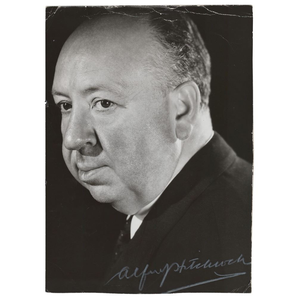 Very attractive semi-glossy 8.25 x 11.5 silver gelatin portrait photo of Alfred Hitchcock against a dark background, signed in white grease pencil. In very good condition, with trimmed edges, a scratch to Hitchcock's cheek, and overall creasing of varying degrees, heaviest to the top edge. In spite of its flaws, this is an extremely appealing and highly displayable portrait of the great director.