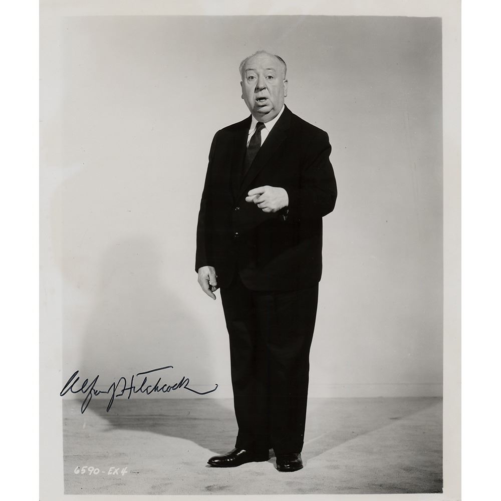 Glossy 8 x 9.5 full-length photo of the great director with a quizzical, perhaps surprised, expression, signed in black felt tip by Alfred Hitchcock. In fine condition.