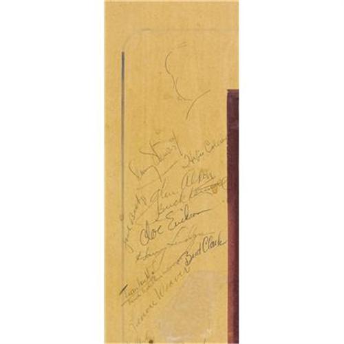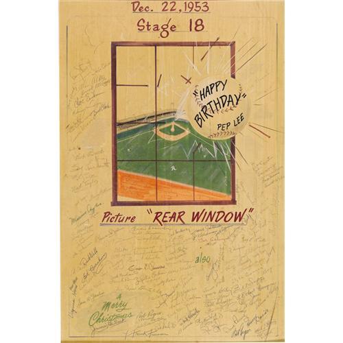 <B>Alfred Hitchcock and Others Signed "Rear Window" Drawing.</B></I> Dated December 22, 1953, and presented to one Pep Lee as a birthday gift, this playful baseball/broken window-themed drawing is titled "Picture 'Rear Window' " and signed by numerous cast and crew members of the classic thriller, including director Alfred Hitchcock and stars James Stewart and Grace Kelly. In Very Fine condition with some mild to moderate tanning, matted to an overall size of 24" x 33.5".<I>Accompanied by LOA from PSA/DNA.</B></I><BR><BR><b>Shipping:</b> Other (oversized items, group lo (<a target="_blank" href="http://www.heritageauctions.com/common/shipping.php">view shipping information</a>)