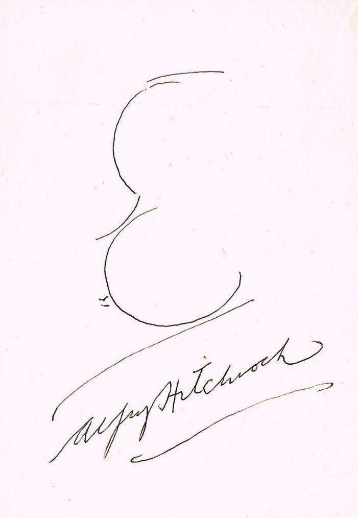 A self portrait from the master of suspense - Alfred Hitchcock. Written in biro on a book page, supplied with coa and professionally mounted and framed. Condition: Very good.