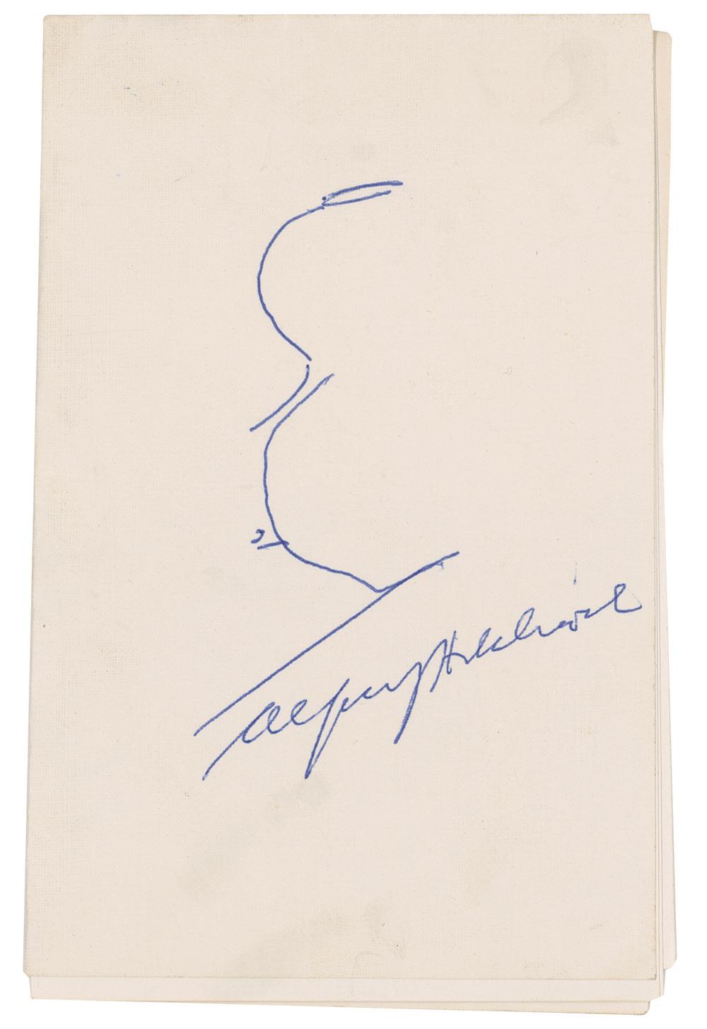 Original signed ballpoint self-portrait of Hitchcock’s familiar profile on an off-white sheet, folded to a size of 3.5 x 5.5. In fine condition.