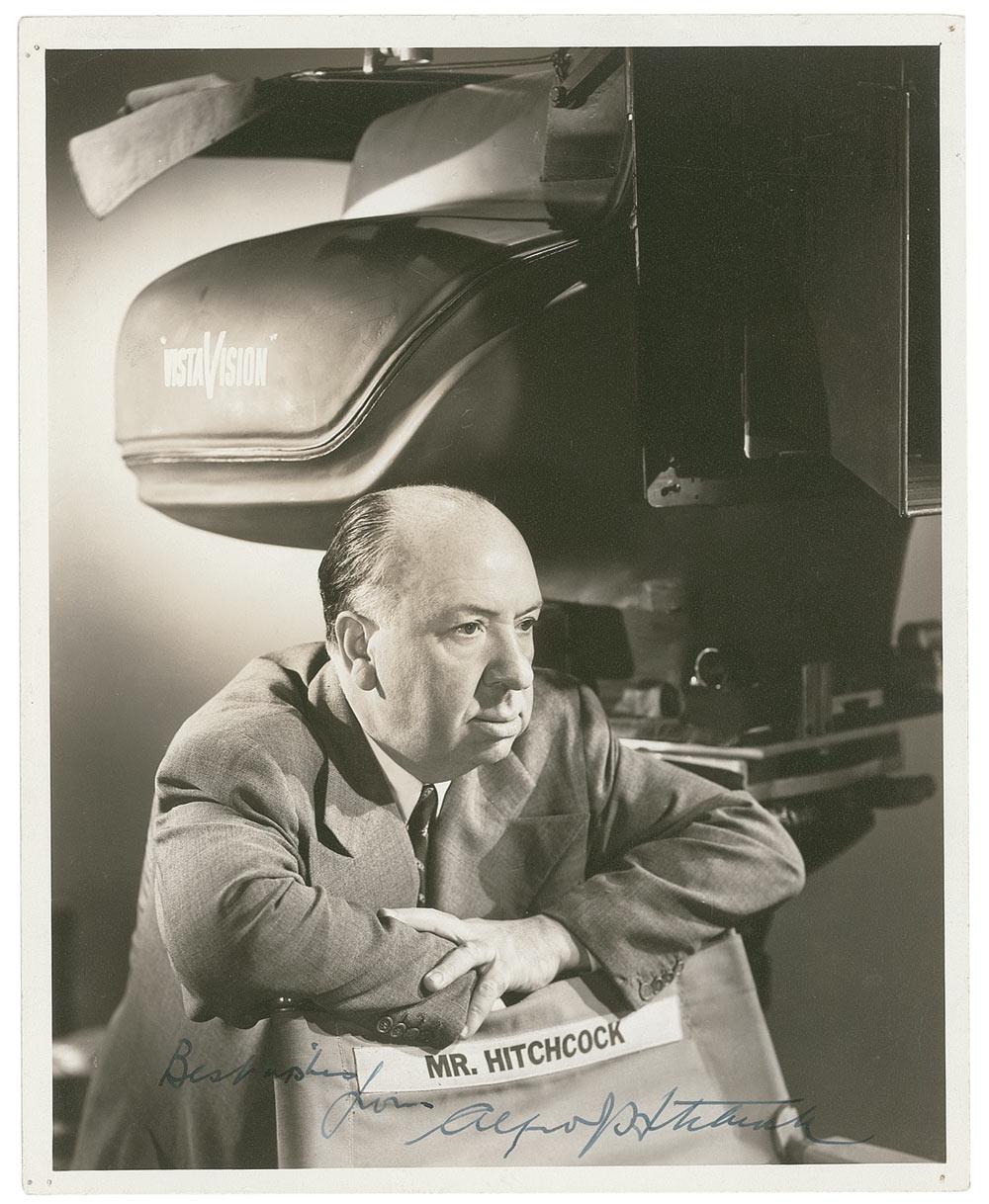 Vintage matte-finish 8 x 10 Paramount publicity photo of Hitchcock leaning casually on his director’s chair with a large VistaVision camera in the background, credited to Bud Fraker, signed in fountain pen, “Best wishes from Alfred Hitchcock.” In fine condition, with tack holes to each corner tip, a few trivial creases, and some light discoloration to facial area and background. A wonderful pose of Hitchcock in his element.