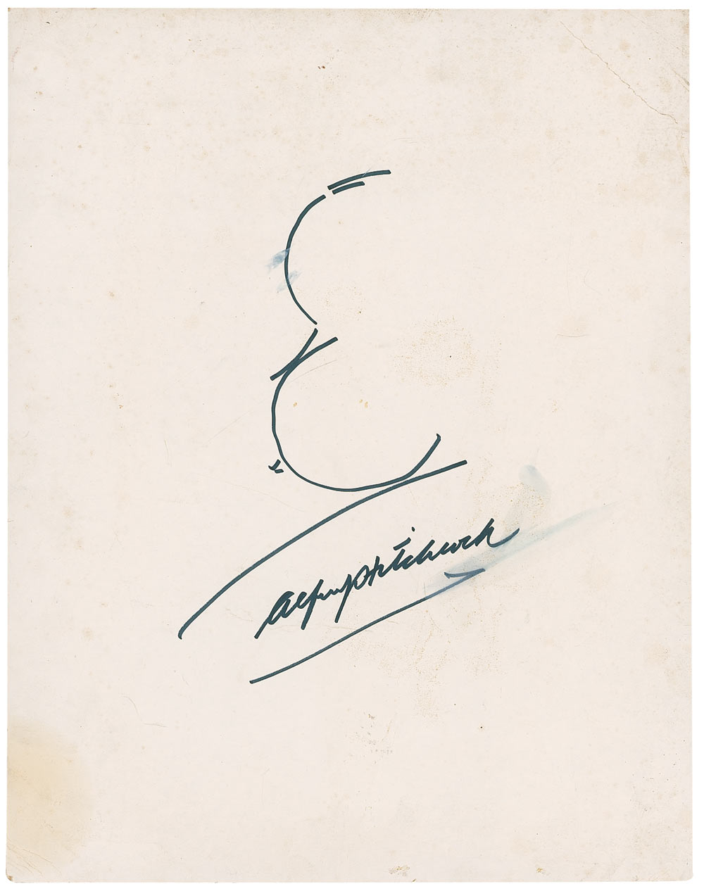 Original signed felt tip self-portrait of Hitchcock’s familiar profile on an off-white 11 x 14 sheet of heavy cardstock. In very good condition, with a couple small brushes to signature and sketch, scattered toning and foxing, and creasing to corners.