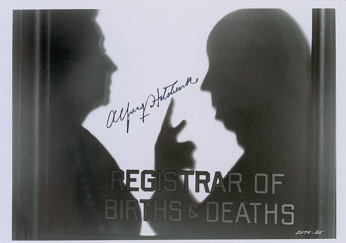 Glossy 10 x 7 photo of Hitchcock’s unmistakable profile behind a frosted window in Family Plot, signed in black ink. Scattered surface creases and spotting to the finish, impressions from something being written on top of the photo, a trimmed lower edge, and some irregular adhesion to the signature, otherwise fine condition.