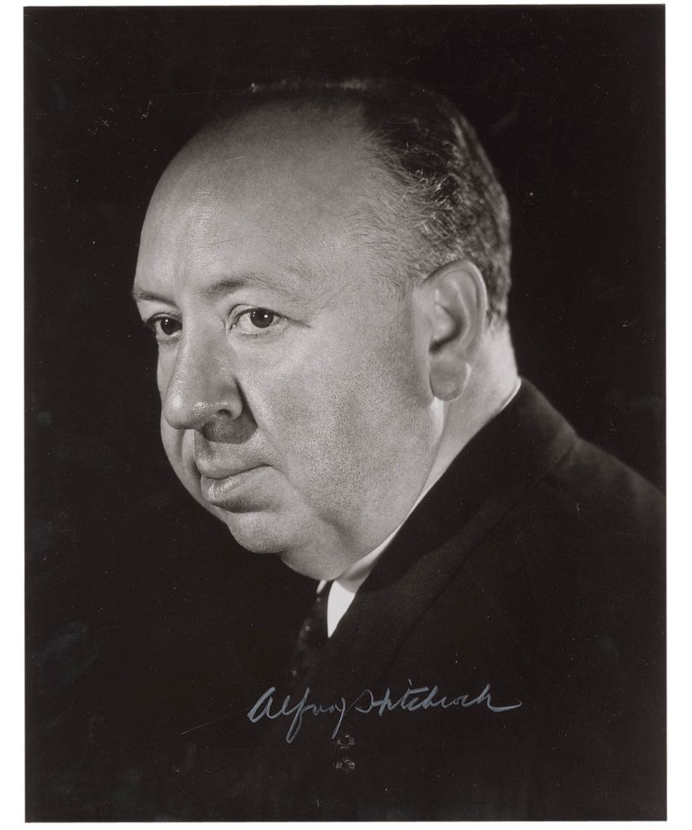 Pearl-finish 11 x 13.75 photo of Hitchcock looking over his shoulder, nicely signed in white artist’s pencil. Rippling to bottom edge, a couple circular impressions under signature and a few scattered light surface marks, otherwise fine condition.