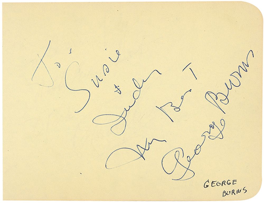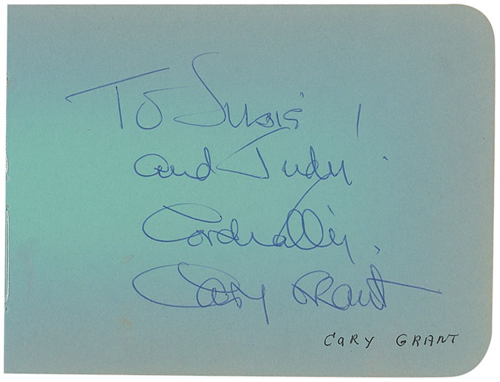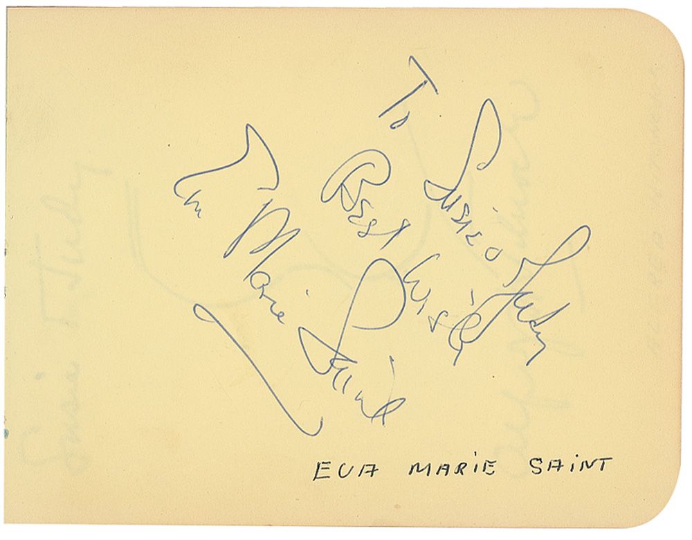 Original vintage signed and inscribed fountain pen profile self-portrait on an off-white 4.5 x 6 album page. Page is still contained in its original 6 x 4.75 hardcover autograph album, signed by over 20 other celebrities, most adding inscriptions, including Anthony Quinn, Cary Grant, Eva Marie Saint, George Burns, Dorothy Malone, and Bing Crosby. In fine condition.