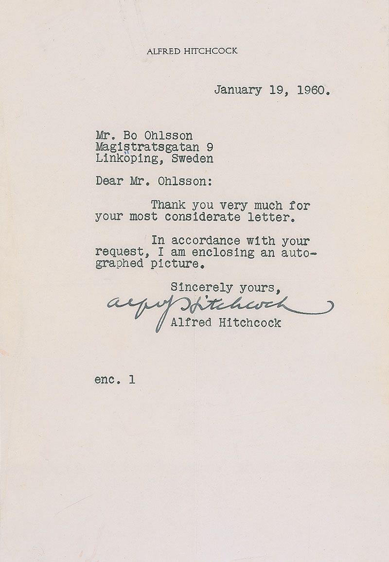 TLS, one page, 6.25 x 9, personal letterhead, January 19, 1960. Letter to a Swedish admirer. In full: “Thank you very much for your most considerate letter. In accordance with your request, I am enclosing an autographed picture.” Central vertical and horizontal folds (vertical fold passing through the first letter of his surname) and moderate scattered creases, otherwise fine condition.