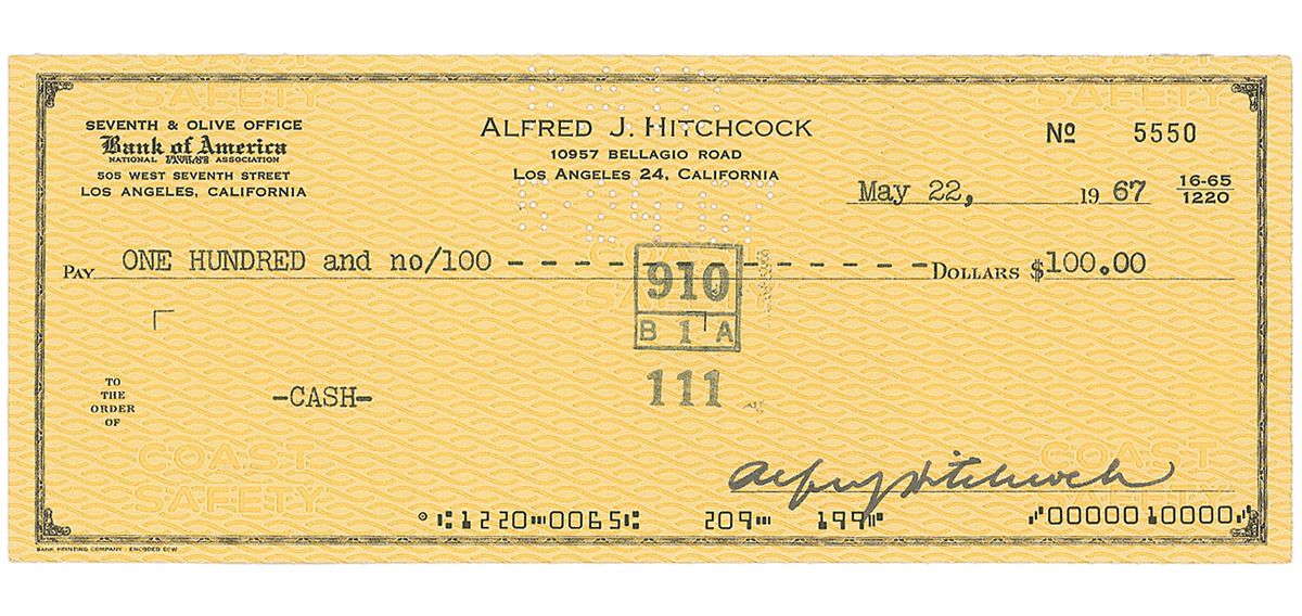 Personal check, 8.5 x 3.25, filled out in type and signed by Hitchcock, payable to cash for $100, May 22, 1967. In fine condition, with expected bank stamps and cancellation holes, and one small tear to the upper edge.