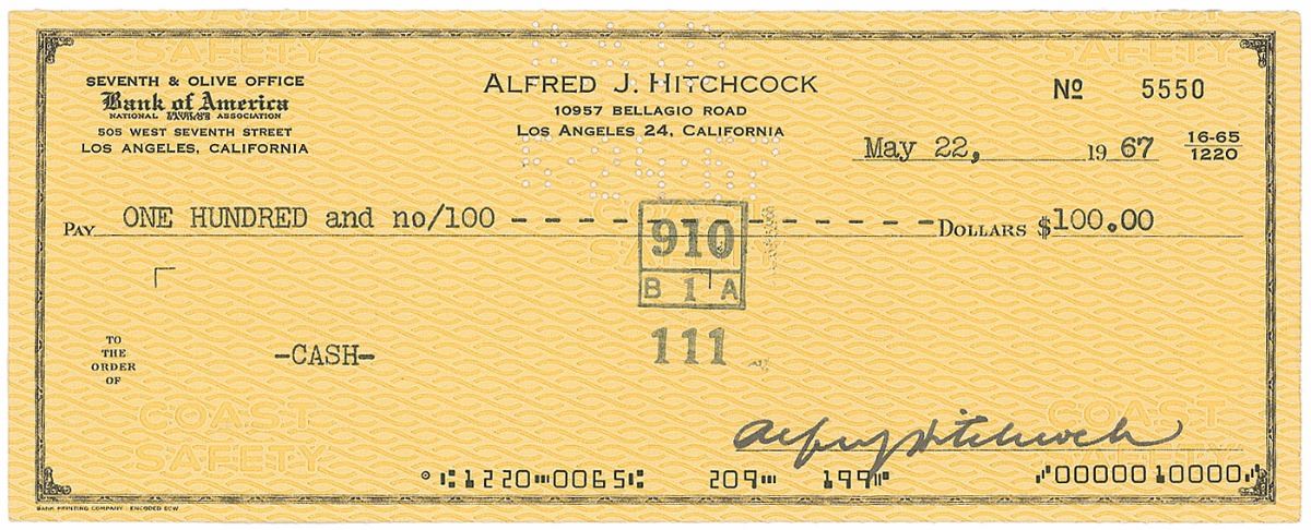 Personal check, 8.5 x 3.25, filled out in type and signed by Hitchcock, payable to cash for $100, May 22, 1967. In fine condition, with expected bank stamps and cancellation holes, and a small tear to top left edge.