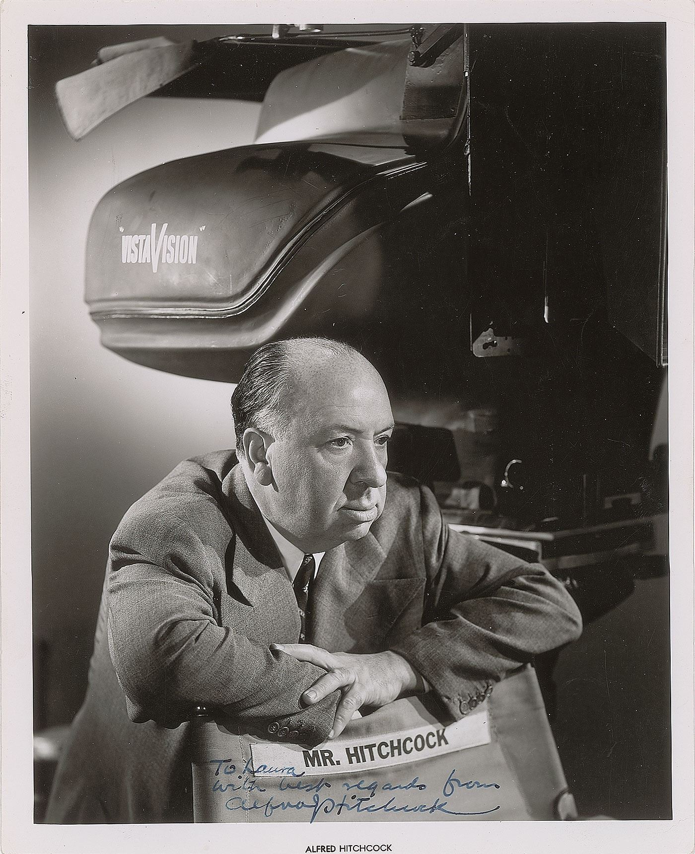 Superb vintage glossy 8 x 10 studio photo of Hitchcock leaning on his director's chair below a large VistaVision camera setup, signed and inscribed in fountain pen, "To Laura, with best regards from, Alfred Hitchcock.” Reverse bears a Bud Fraker / Paramount photo stamp. In fine condition, with scattered light creasing.