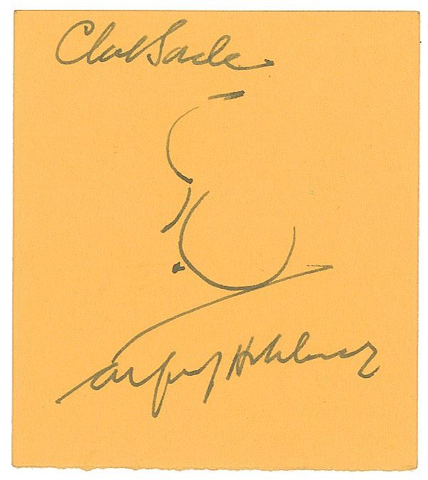 Original ink self-portrait sketch of Alfred Hitchcock's immediately recognizable profile on the reverse of a yellow 3.75 x 4.25 ticket for the Inaugural Ball of Lyndon B. Johnson on January 20, 1965, signed below the sketch by Hitchcock, who adds an inscription above. In fine condition.
