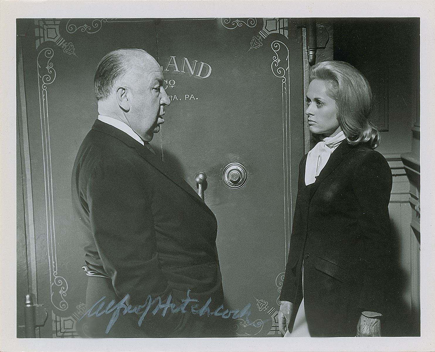 Glossy 10 x 8 photo of Alfred Hitchcock directing actress Tippi Hedren on the set of the 1964 thriller Marnie, signed in white wax pencil by the director. In fine condition.