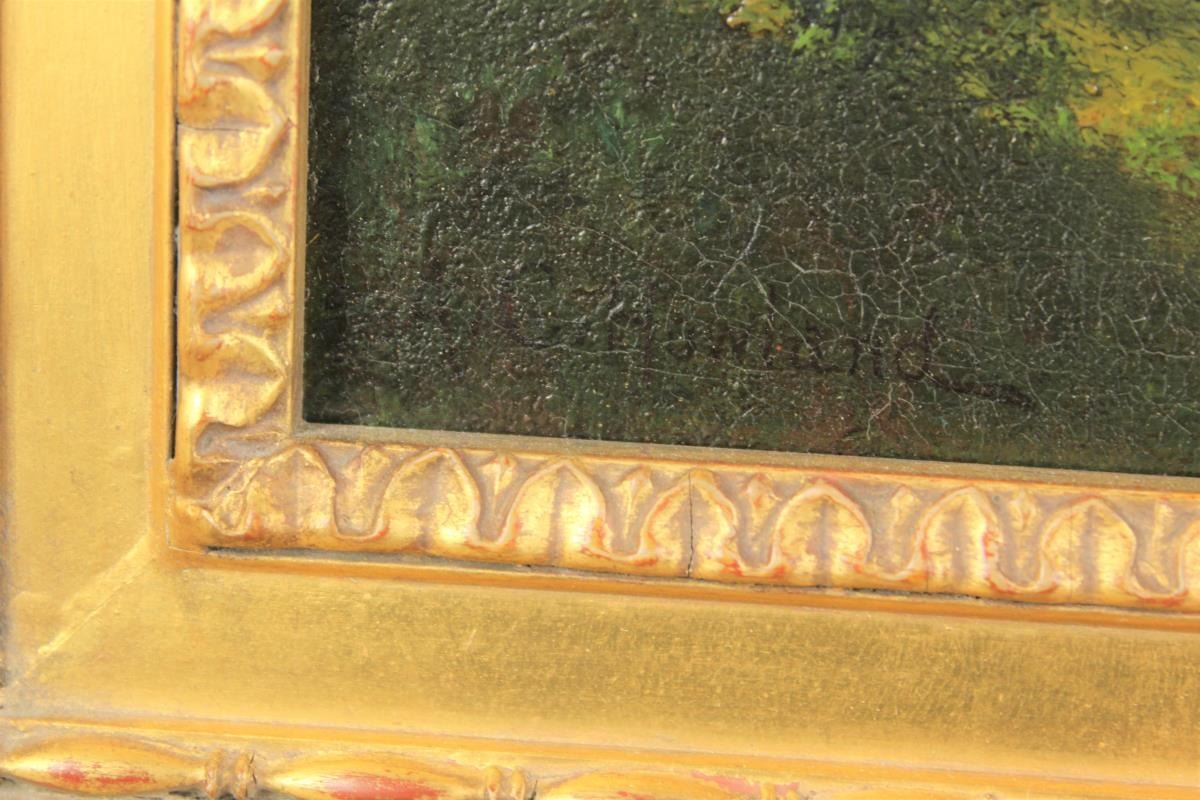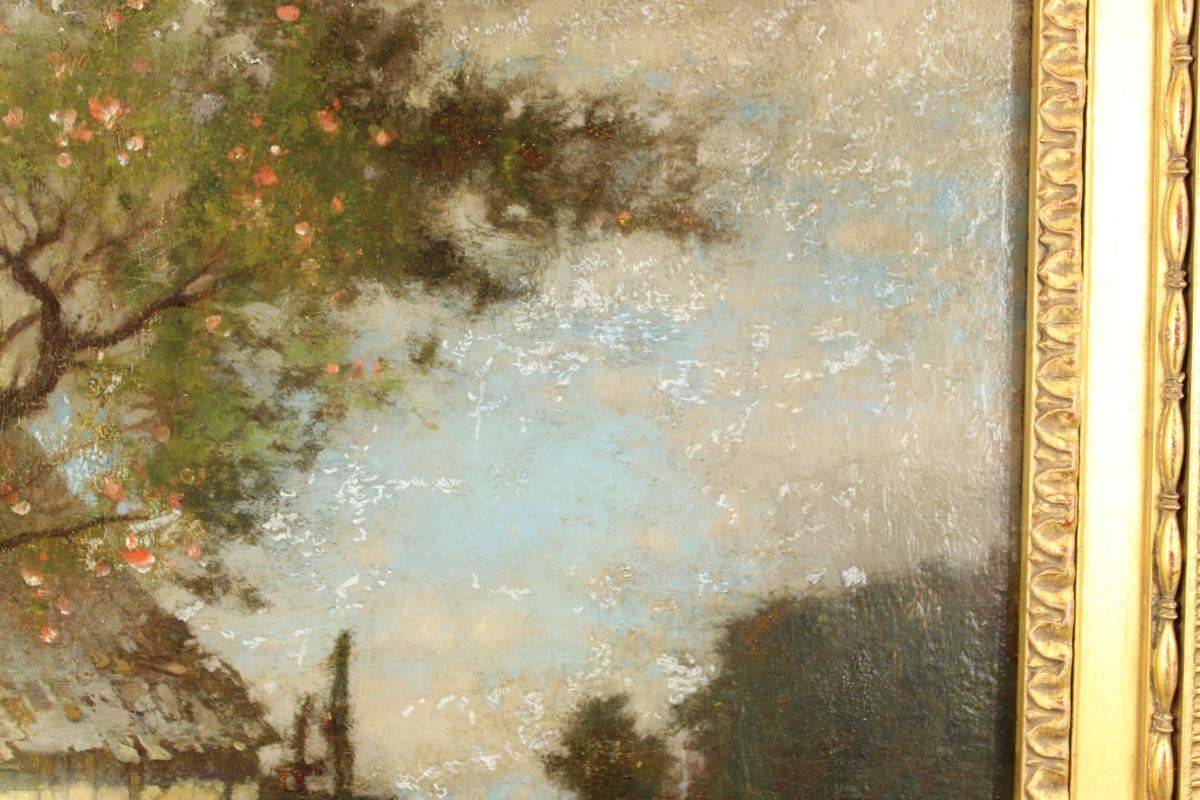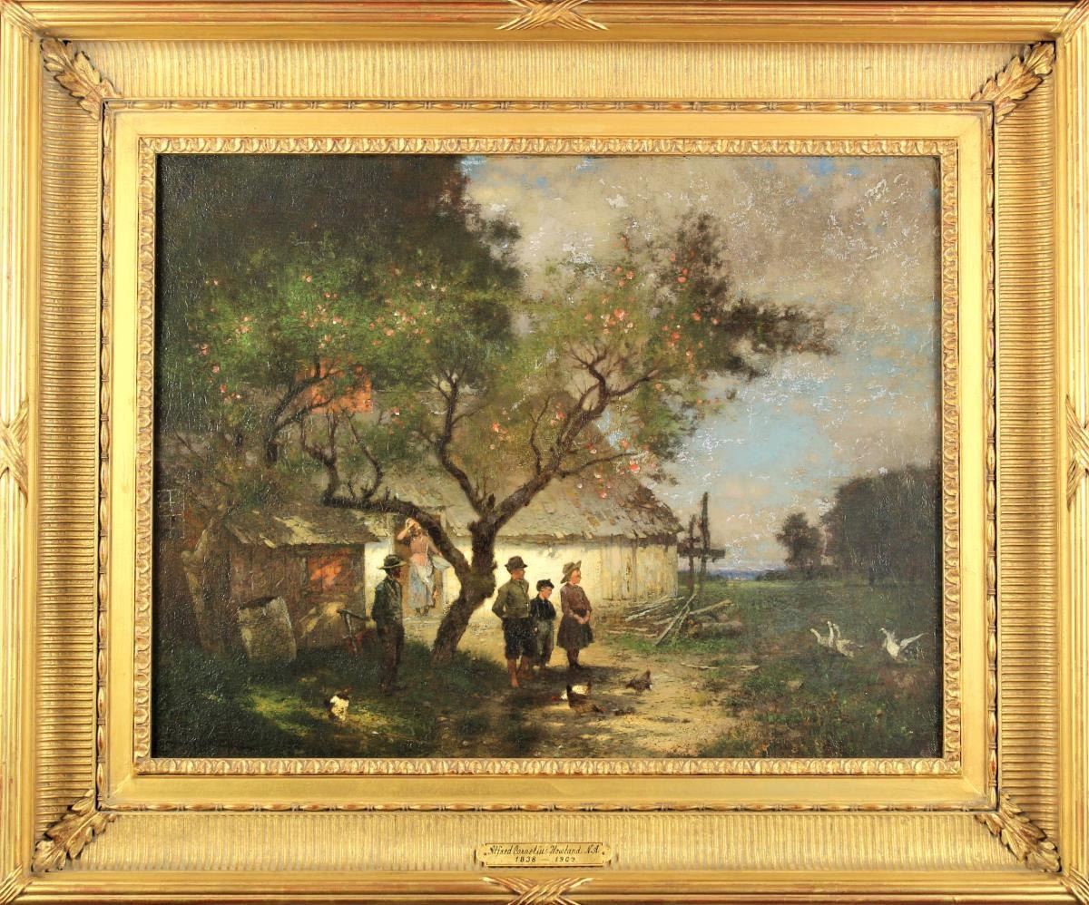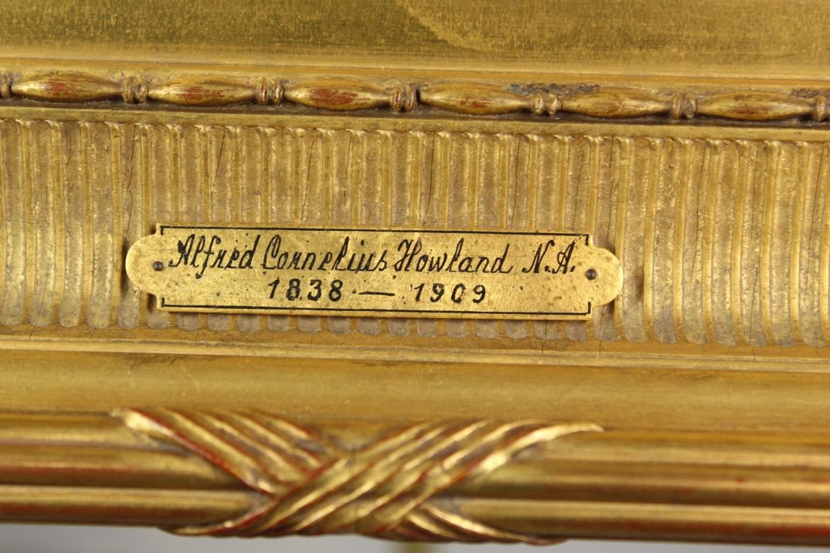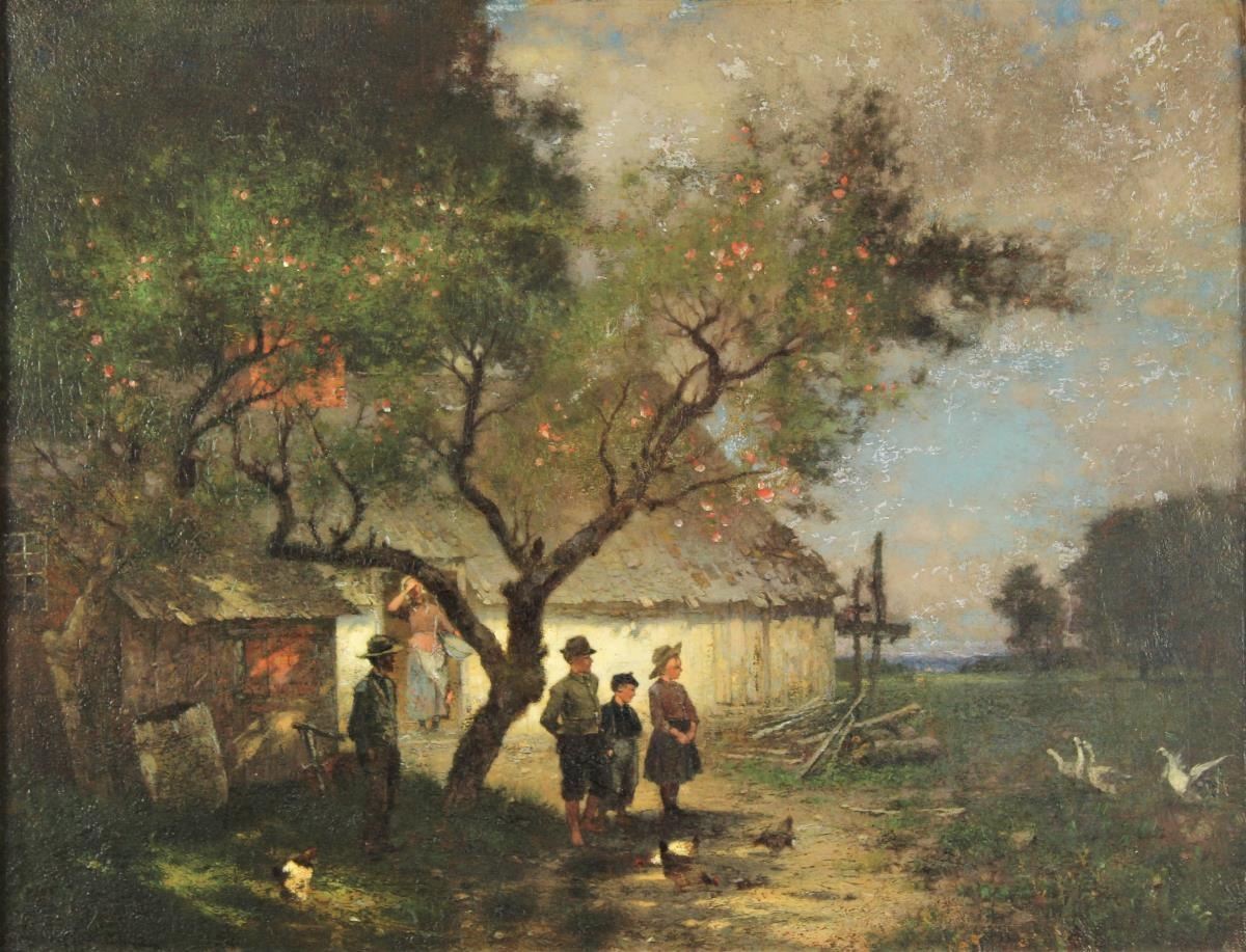 "Farmyard Scene," Oil on canvas painting by Alfred Cornelius Howland, signed in the lower left. Exterior scene with figures standing in the landscape with chickens and swans. Provenance: acquired at Doyle Gallery NYC. Alfred Cornelius Howland, a tonalist painter of light-filled, cheerful story-telling landscapes and genre scenes, was born in 1838 in Walpole, New Hampshire. In 1855, he graduated from Walpole Academy and then went to Boston, where he found employment as an engraver and studied drawing and lithography with Max Eppendorff and Paul Schulze.