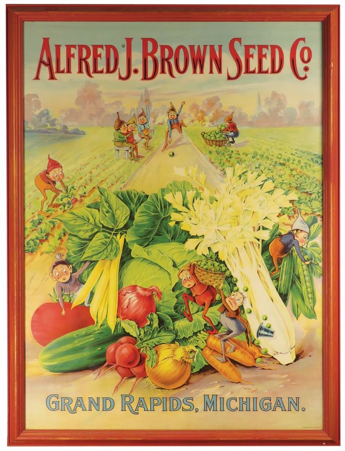 Alfred J. Brown Seed Co. Paper Sign, Grand Rapids, Mich. Outstanding color and graphics depicting the industrious "Brownie's". Framed under glass. 24 X 33 inches.