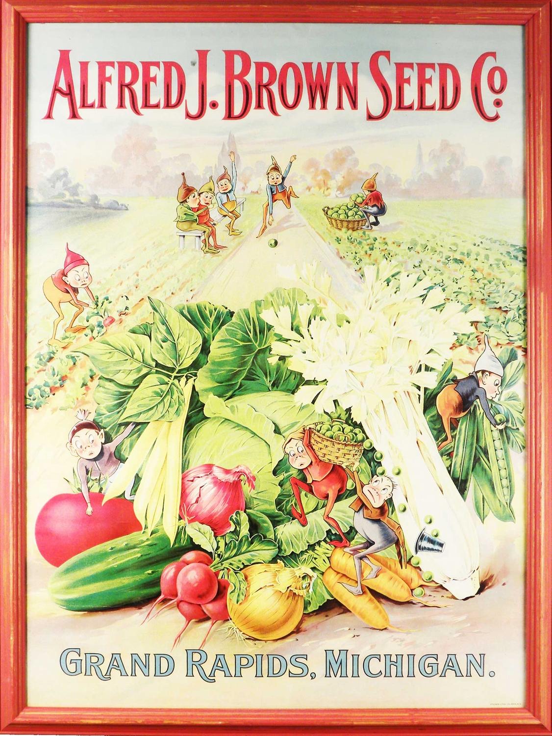 Alfred J. Brown Seed Company Paper Sign. Grand Rapids, MI. Depicting "Brownies" in the field picking produce. Stecher Litho Co. Roch. NY. Framed under glass. Near mint condition. 24 X 33 inches image only.