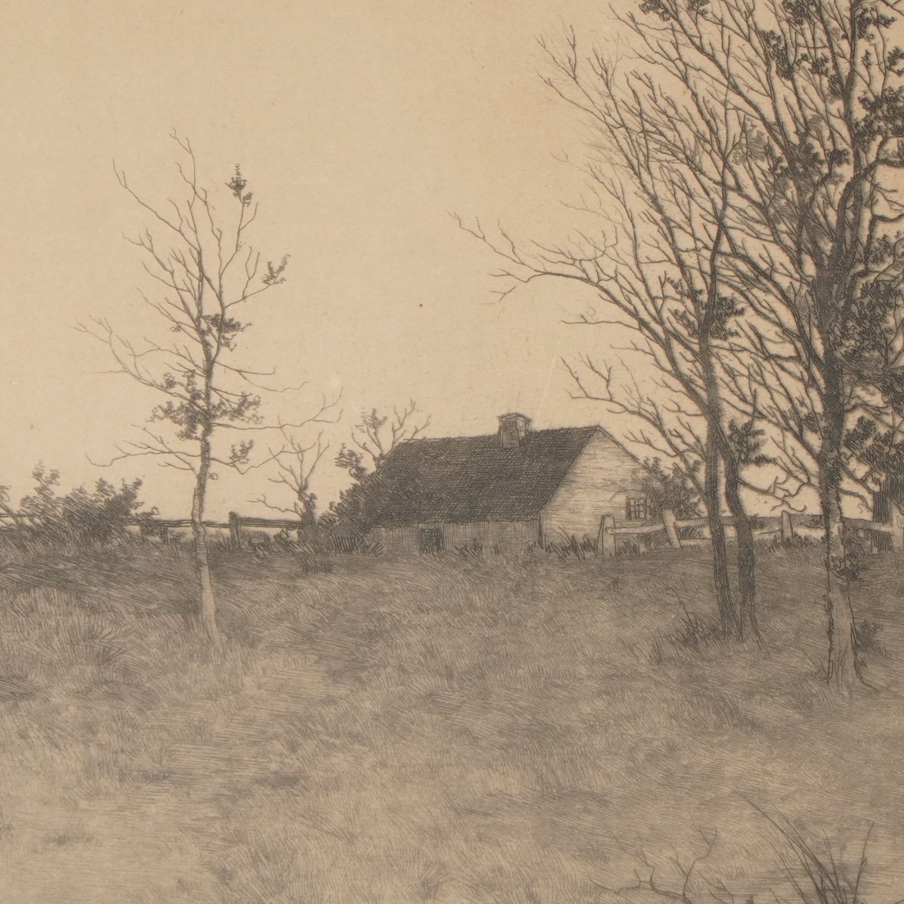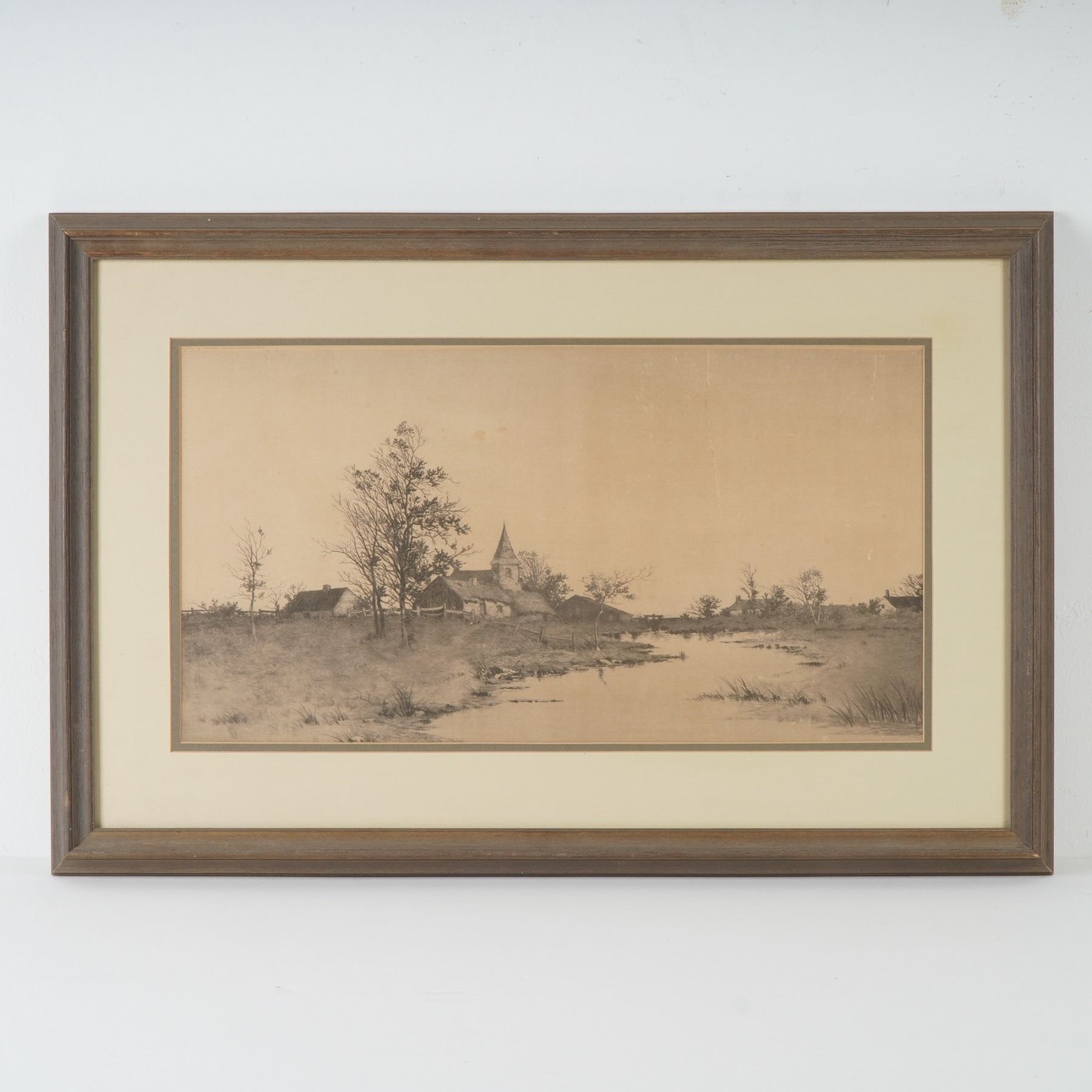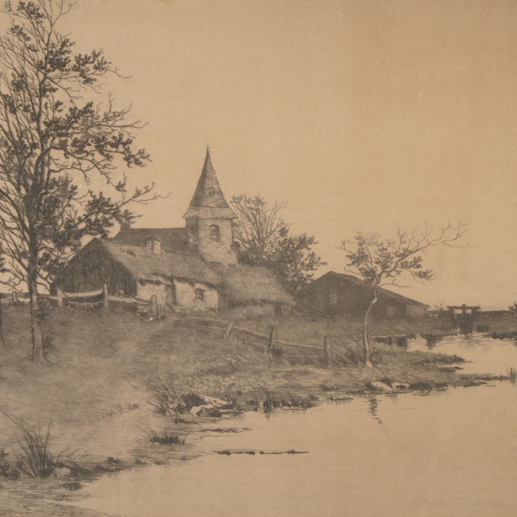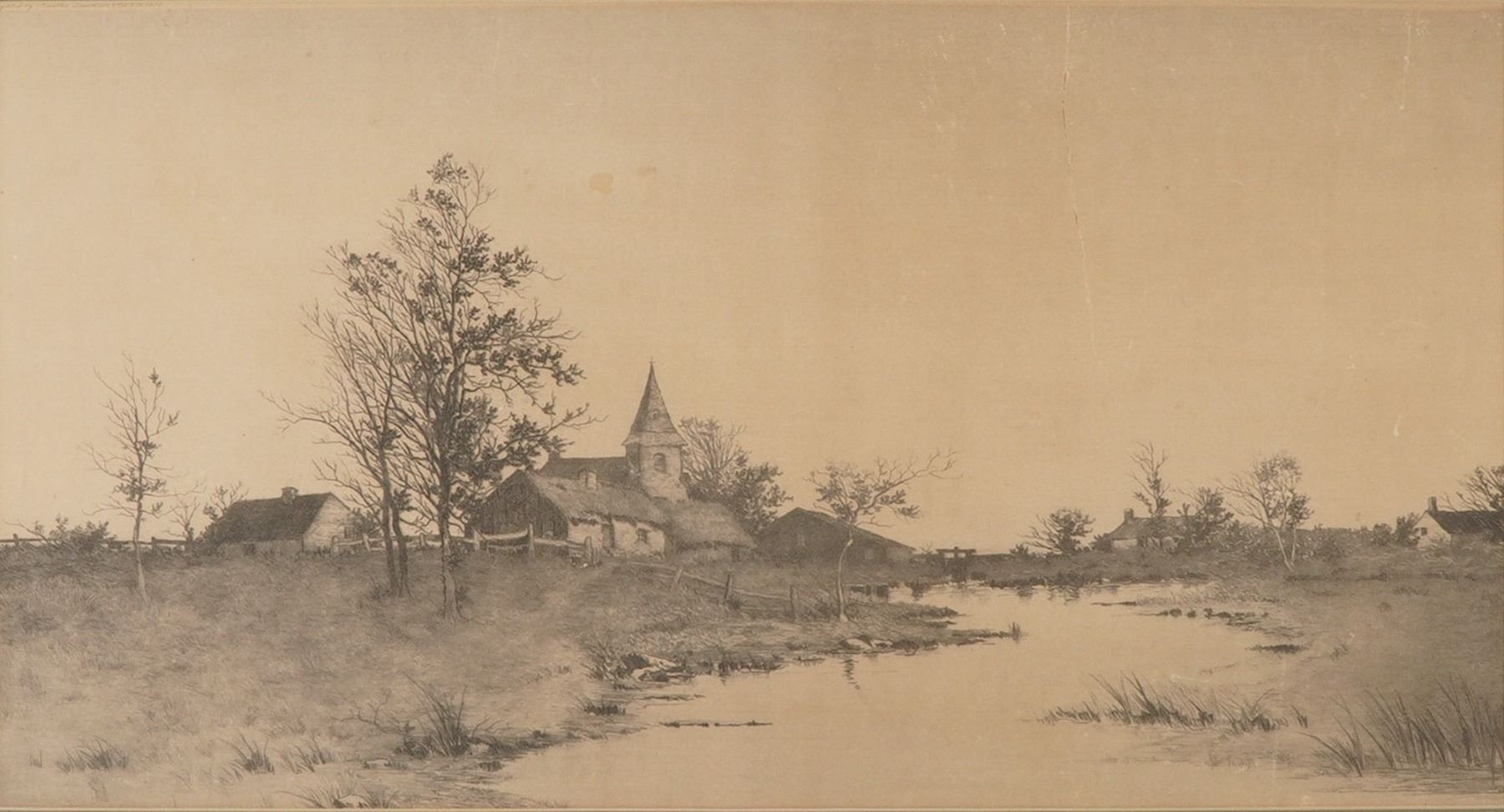 A beautifully detailed etching by Alfred J. Haller, depicting a serene riverside village with thatched cottages, leafless trees, and a steepled church reflected in calm waters. Executed with remarkable precision and tonal balance, the composition captures the quiet charm of rural life at the turn of the century. The upper left bears the printed line Copyrighted by Radtke, Lauckner & Co. N.Y. 1892, confirming its publication by the renowned 19th-century New York print publishers known for their fine art reproductions. Housed under glass in a period wooden frame with a cream mat. A lovely and atmospheric example of late 19th-century American etching. Signed J. Haller in graphite at lower right.