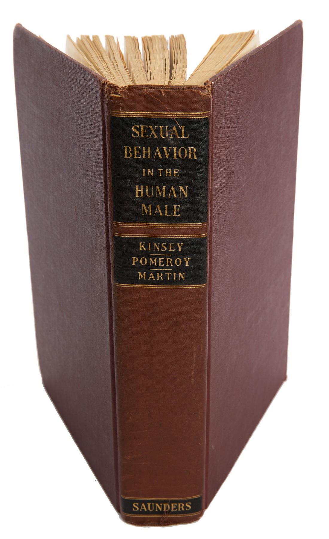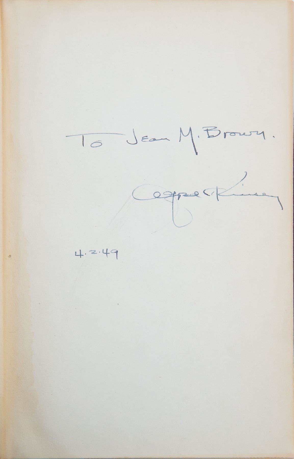 Biologist (1894–1956) who in 1947 founded the Institute for Sex Research at Indiana University, and whose research on human sexuality created the modern field of sexology. Signed book: Sexual Behavior in the Human Male. Later printing. Philadelphia: W. B. Saunders Company, 1948. Hardcover, 6.25 x 9.25, 804 pages. Signed and inscribed on the first free end page in fountain pen, "To Jean M. Brown, Alfred Kinsey, 4.2.49." In fine condition, with light fraying at spine ends and a slightly loose binding. Jean Brown worked with Kinsey at the Indiana University Institute for Sex Research, now known as 'The Kinsey Institute.' Her work, including her 1940 book The Psychodynamics of Abnormal Behavior, is cited twice in the present volume.