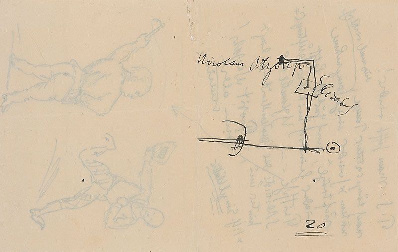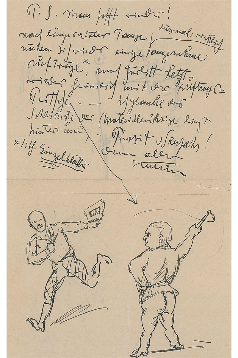 Austrian artist and occasional writer (1877–1959), a member of the Blaue Reiter group, best known for his expressionistic illustrations for works by Poe, Dostoevsky, E. T. A. Hoffmann, and others. ALS in German, signed “Kubin,” one page, 5.5 x 8.75, no date. Brief letter, in part (translated): “Some very good orders this time…also Gurlitt is trying to order eagerly from me. I think most of the financial crises is behind us.” The letter is highlighted by a detailed self-portrait sketch on the lower half, showing Kubin trying to escape from the gallerist and publisher Gurlitt. Central vertical and horizontal folds, a noticeable but unobtrusive tear to right edge, and slight show-though from a bit of writing to reverse, otherwise fine condition.