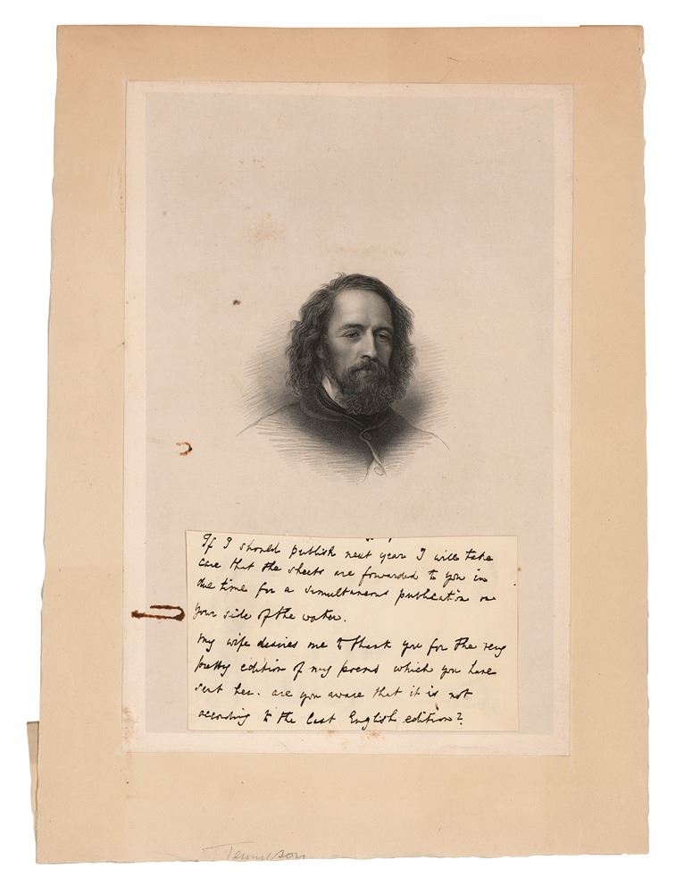 Unsigned partial handwritten letter by Alfred Lord Tennyson, one page, 4.25 x 2.5, no date. The celebrated poet writes concerning the release of a work, evidently to an American publisher. In part: "If I should publish next year I will take care that the sheets are forwarded to you in due time for a simultaneous publication on your side of the water. My wife desires me to thank you for the very pretty edition of my poems which you sent her. Are you aware that it is not according to the last English edition?" Affixed to a larger engraved portrait and in very good to fine condition, with a couple rusty paperclip marks to the left side.