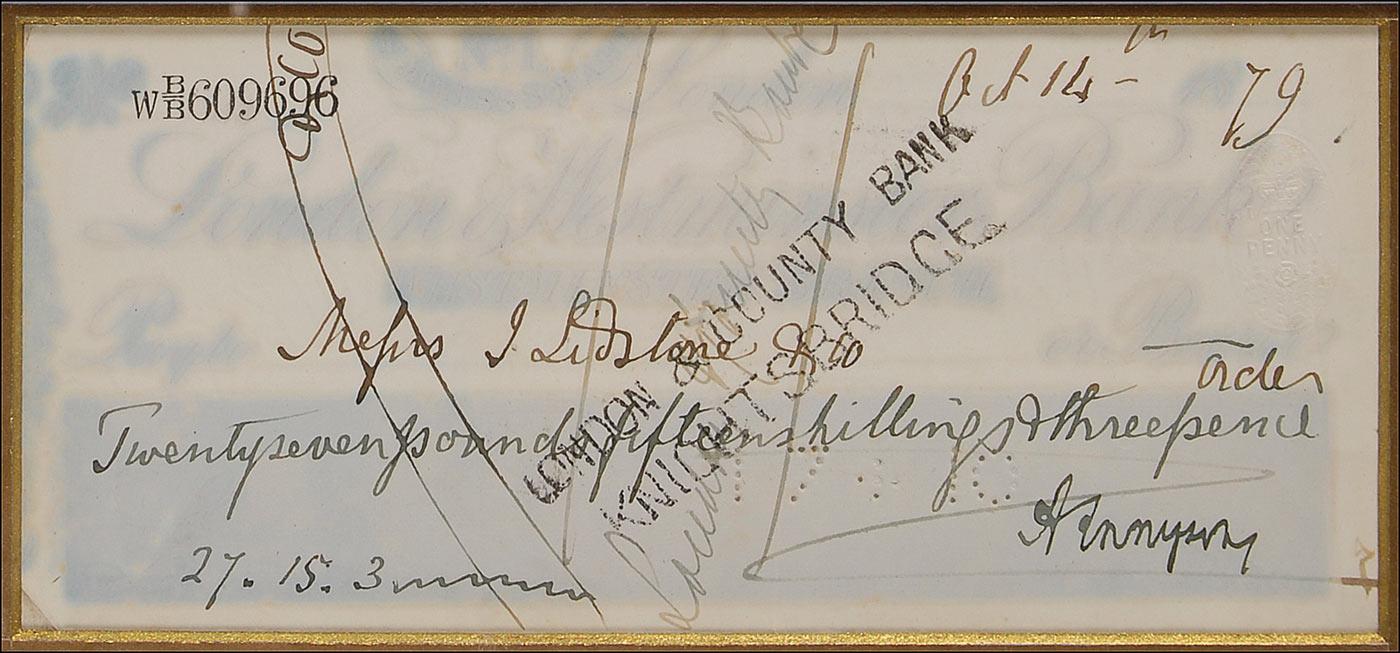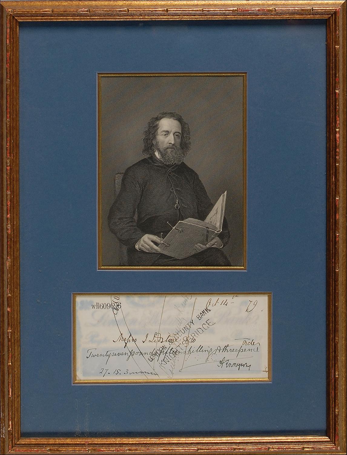 Distinguished British poet (1809–1892) who was one of the most highly regarded and influential literary figures of the Victorian era. Bank check, 7 x 3, filled out in another hand and signed by Tennyson, payable to Messrs. J. Lidstone & Co. for £27.15.3, October 14, 1879. Double matted and framed with an engraved portrait to an overall size of 12.5 x 17. Cancellation holes and signature to check body, and light overall fading to printed portions of signature, most likely from moisture exposure, but not affecting the bold signature, otherwise fine condition.