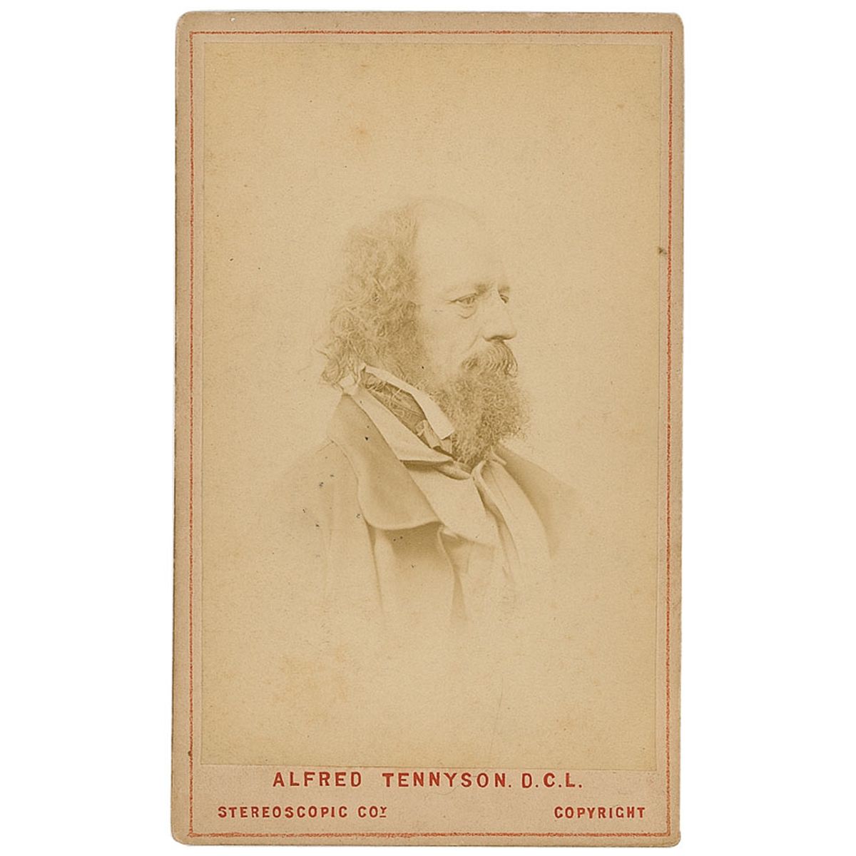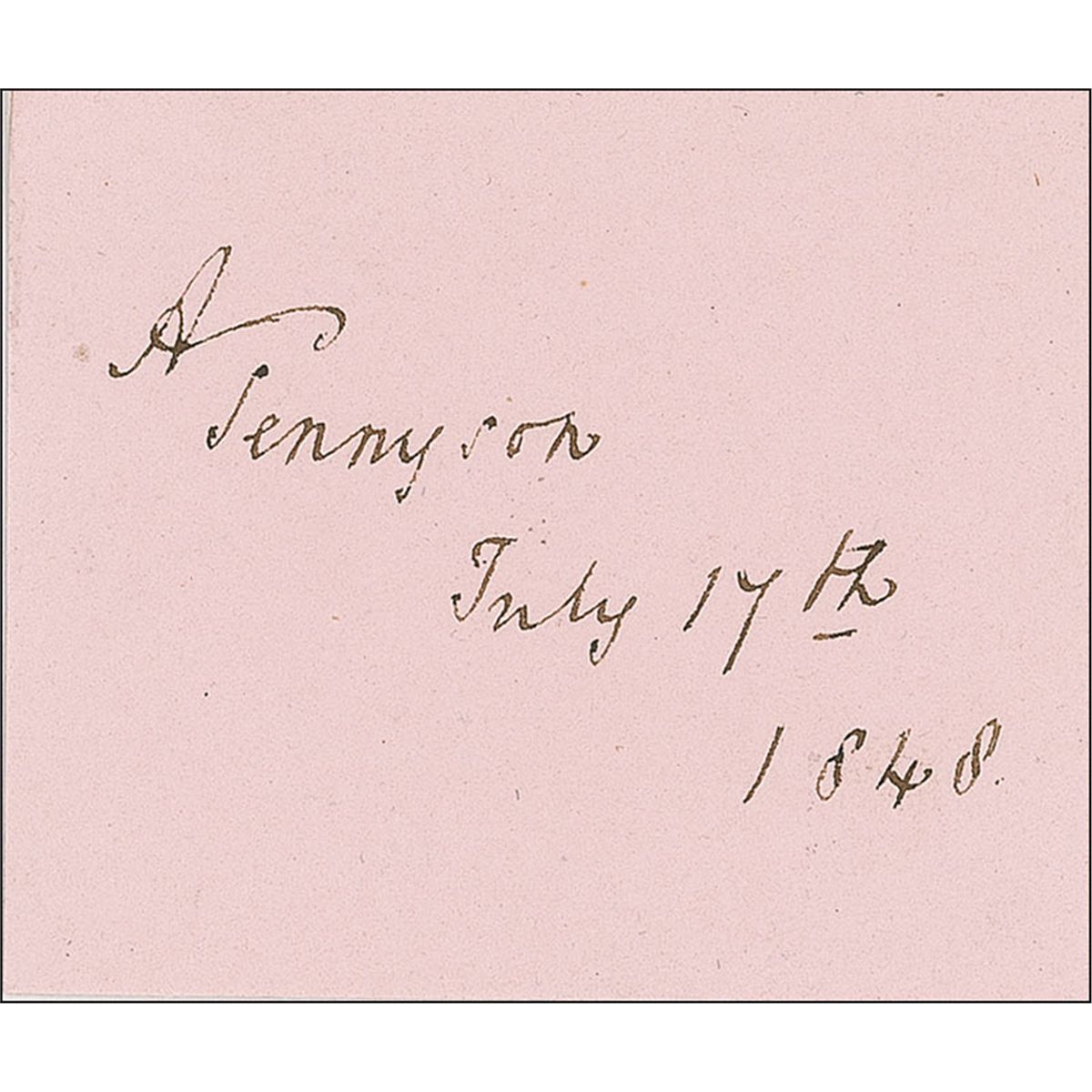 Ink signature, “A. Tennyson, July 17th, 1848,” on a light pink 2.25 x 2 card. In fine condition. Accompanied by an unsigned original carte-de-visite portrait of Tennyson by the London Stereoscopic and Photographic Company.