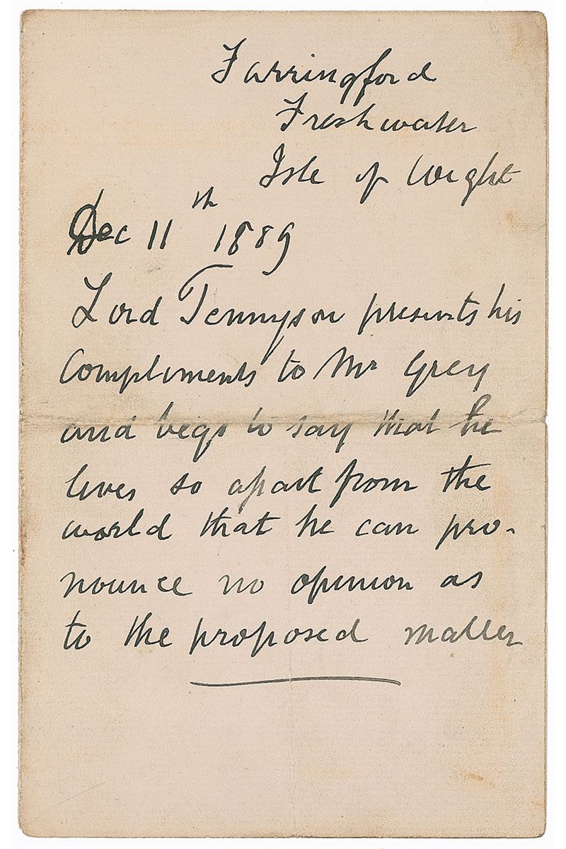Third-person ALS, one page, 4.5 x 7, December 11, 1889. In full: “Lord Tennyson presents his compliments to Mr. Grey and begs to say that he lives so far apart from the world that he can pronounce no opinion as to the proposed matter.” In very good condition, with wear to central horizontal mailing fold (affecting one line of text), and some light toning and soiling.