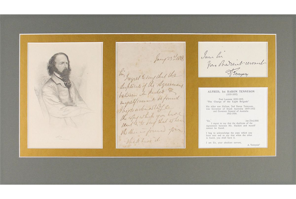 ALS signed “A. Tennyson,” one page both sides, 4.25 x 6.5, January 23, 1866. Letter to a gentleman. In full: “I regret to say that the duplicate of the Agreement between Mr. Hackett and myself cannot be found. I beg to acknowledge the copy which you have sent and to say that when the other is found, you shall have it.” Matted and framed with a portrait of Tennyson, image of the reverse, and the text of a poem to an overall size of 18.75 x 11, with an open back for viewing the signature on the reverse. Scattered foxing, otherwise fine condition.