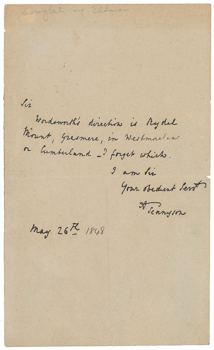ALS signed “A Tennyson,” one page, 4.25 x 7.25, May 26, 1848. In full: “Wordsworth’s direction is Rydal Mount, Grasmere in Westmoreland or Cumberland—I forget which.” In fine condition. Two years after this letter was written, Tennyson succeeded Wordsworth as the Poet Laureate of Great Britain. A wonderful connection between two of history’s greatest poetic minds.