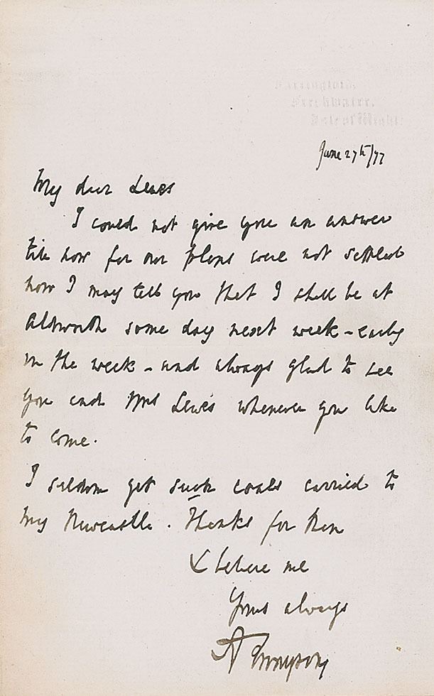 ALS signed “A. Tennyson,” one page, 4.5 x 7.25, Farringford letterhead, June 27, 1877. Letter to philosopher and literary critic George Henry Lewes, in full: "I could not quite give you an answer till now for our plans were not settled now I may tell you that I shall be at Aldworth some day next week—early in the week—and always glad to see you and Mrs. Lewes whenever you like to come. I seldom get such coals carried to my Newcastle. Thanks for them." In fine condition.