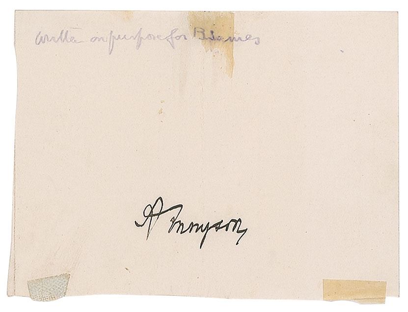 Bold ink signature, "A. Tennyson,” on an off-white 4 x 3 slip. In fine condition, with old tape to the edges, away from the signature.