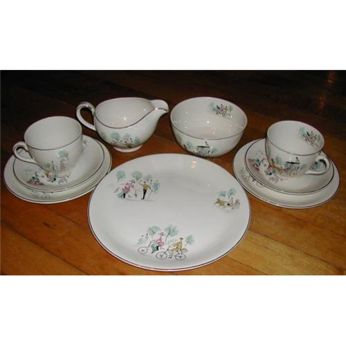 A superb 21 piece china dinner set by highly collectable Alfred Meakin English designer who produced affordable dinnerware in the 1950's often inspired by films the factory produced pattern "The Gay Nineties" featuring suited gentlemen on precarious bicycles and ladies with wasp waisted parasols. This set is in great condition with no chips cracks or crazing, i am happy to send more pictures of total set if required .Tea set Has Alfred Meakin Gay Ninteys stamp to base or side plate only,rest has Meakin green back stamp.Large cake plate:9" x1 S/plate:7" x6 Cup:3" x6 Jug:4" x1 Bowl:5" x1 A great collectors item!