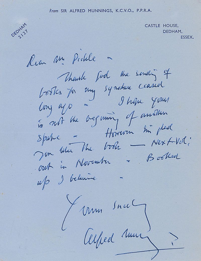 British painter of horses and outspoken critic of Modernism (1878–1959). ALS, one page, 5.25 x 7, personal letterhead, no date. Response to an admirer. In part: “Thank God the sending of books for my signature ceased long ago—I hope yours is not the beginning of another spate. However I’m glad you like the book.” In fine condition.