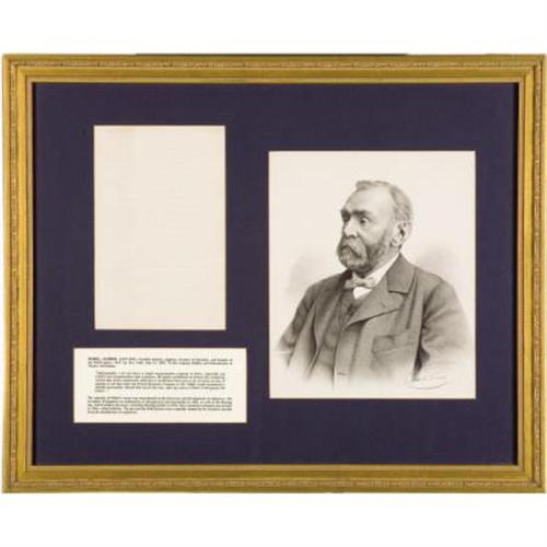 <B>Alfred Nobel Autograph Letter Signed</B></I>. One page, 5.25” x 8.25”, in German, Ischl, Austria, June 21, 1883. Alfred Nobel (1833-1896) was a Swedish chemist, engineer, inventor, and founder of the Nobel prizes. Ironically, the original funding of the prizes, including the Nobel Peace Prize, came from his profits from the manufacture of explosives, including dynamite, which he invented in 1867. In this letter to the company Mahler and Eschenbacher in Vienna, Nobel writes in part: <I>“Unfortunately, I do not know a single transportation company in Paris, especially one which I can recommend for such a purpose. My sphere of influence in France lies completely outside that of the commercial, otherwise it would have been easy to be of service to you. It appears to me that either the French Dynamite Company or Mr. Haffer could recommend a suitable personality. Should that not be the case, after my return to Paris I will pursue the matter.” </B></I>The letter has been matted with a description and an 8.25” x 10” etching of Nobel. The letter would be in very good condition, but the ink has faded considerably due to previous exposure to sunlight.<BR><BR><b>Shipping:</b> Books & Catalogs (<a target="_blank" href="http://www.heritageauctions.com/common/shipping.php">view shipping information</a>)