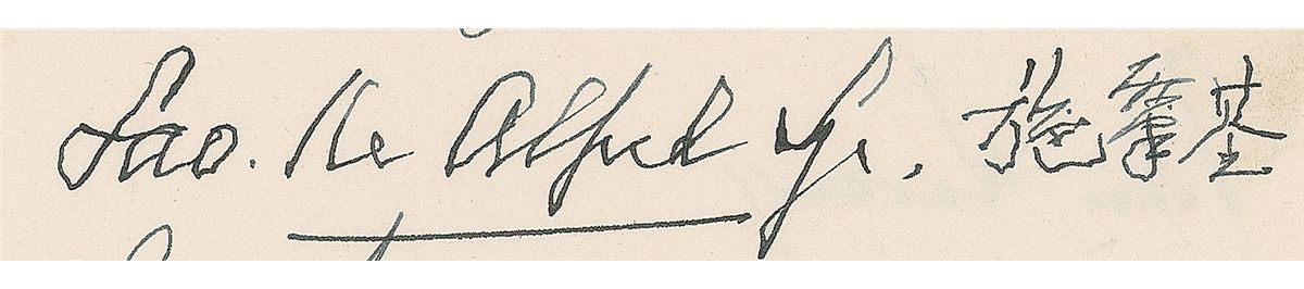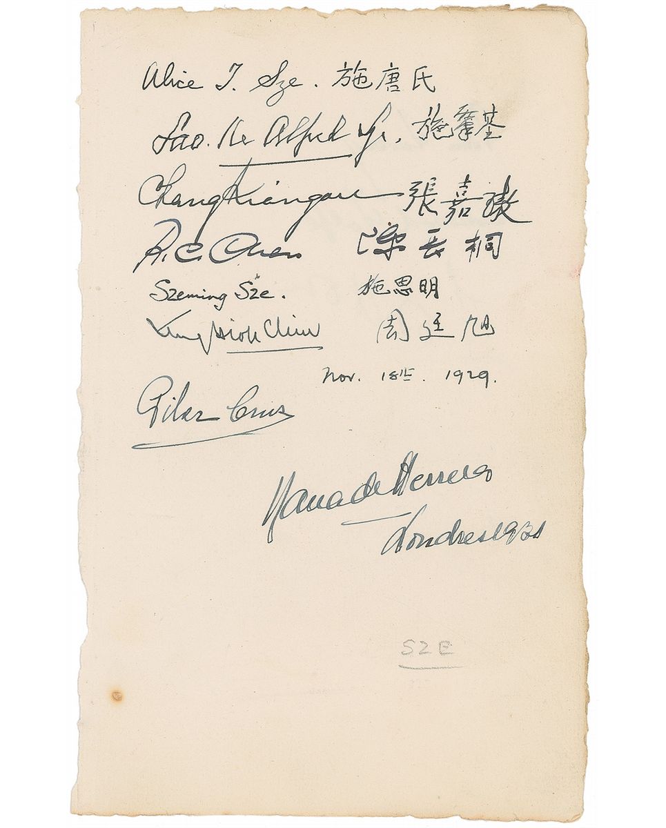 Prominent Chinese politician and diplomat (1877–1958) during the most turbulent period in modern Chinese history. Crisp ink signatures in English and Chinese, “Sao ke Alfred Sze,” on an off-white 5 x 8 album page. Also signed by his wife, “Alice T. Sze”; Minister of Communications, “Chang Kiangau”; co-founder of the World Health Organization, “Szeming Sze,” and four others. In fine condition, with a small spot of toning to lower left edge.