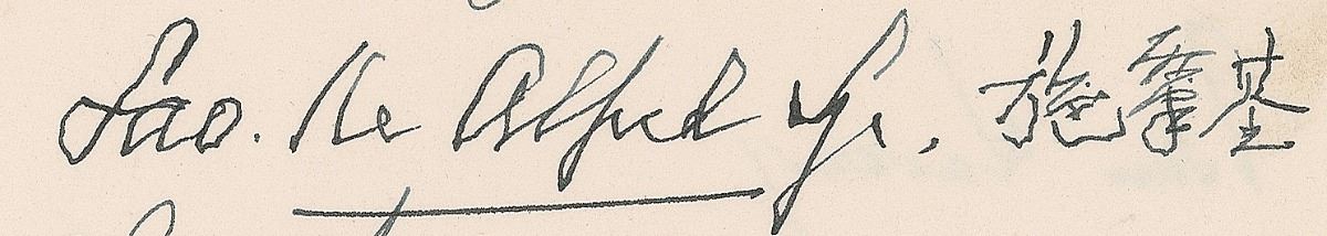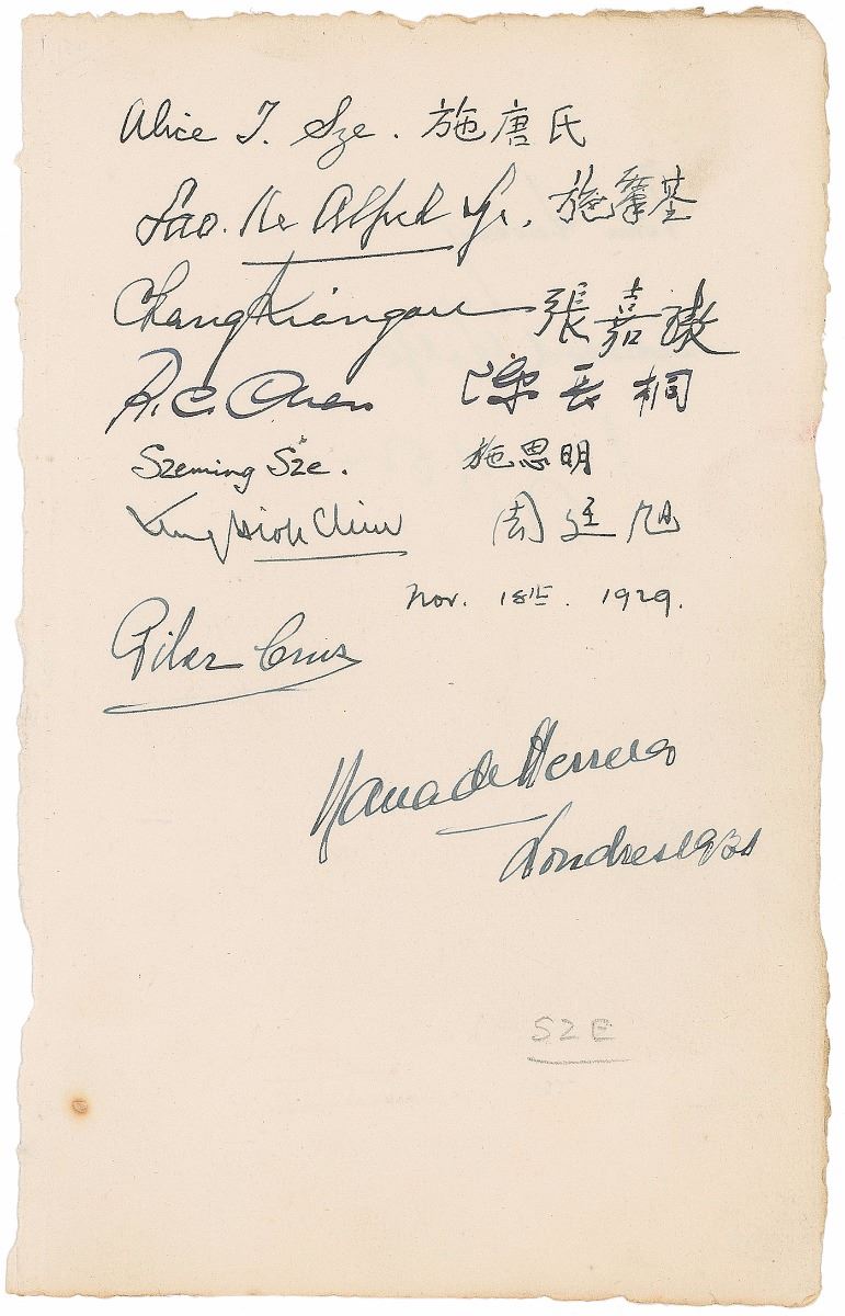 Prominent Chinese politician (1877–1958) and diplomat during the most turbulent period in modern Chinese history. Crisp ink signatures in English and Chinese, “Sao ke Alfred Sze,” on an off-white 5 x 8 album page. Also signed by his wife, “Alice T. Sze”; Minister of Communications, “Chang Kiangau”; co-founder of the World Health Organization, “Szeming Sze,” and four others. In fine condition, with a small spot of toning to lower left edge.