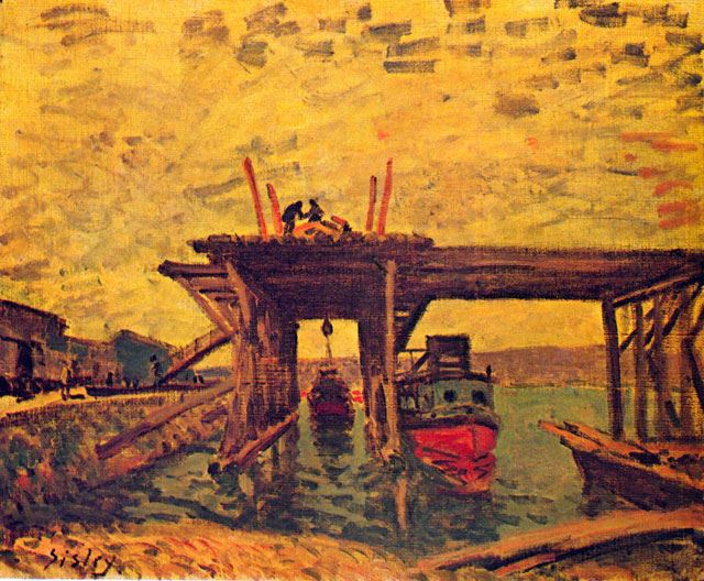 Artist: Alfred Sisley - Title: Bridge under Construction - Medium: Fine Art Reproduction Giclee on Canvas - Image Size: Approximately 16.5 inches x 20 inches - Unframed on Unstretched Canvas - Biography: Alfred Sisley was an Impressionist landscape painter who was born and spent most of his life in France, but retained British citizenship. He was the most consistent of the Impressionists in his dedication to painting landscape en plein air.