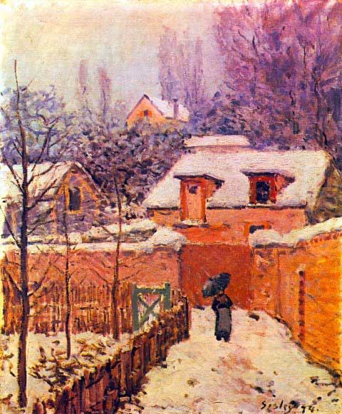 Artist: Alfred Sisley - Title: Garden in the Snow - Medium: Fine Art Reproduction Giclee on Canvas - Image Size: Approximately 20 inches x 16.5 inches - Unframed on Unstretched Canvas - Biography: Alfred Sisley was an Impressionist landscape painter who was born and spent most of his life in France, but retained British citizenship. He was the most consistent of the Impressionists in his dedication to painting landscape en plein air.