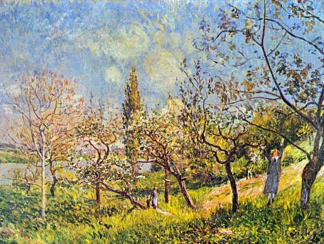 Artist: Alfred Sisley - Title: Orchard in Spring - Medium: Fine Art Reproduction Giclee on Canvas - Image Size: Approximately 15 inches x 20 inches - Unframed on Unstretched Canvas - Biography: Alfred Sisley was an Impressionist landscape painter who was born and spent most of his life in France, but retained British citizenship. He was the most consistent of the Impressionists in his dedication to painting landscape en plein air.