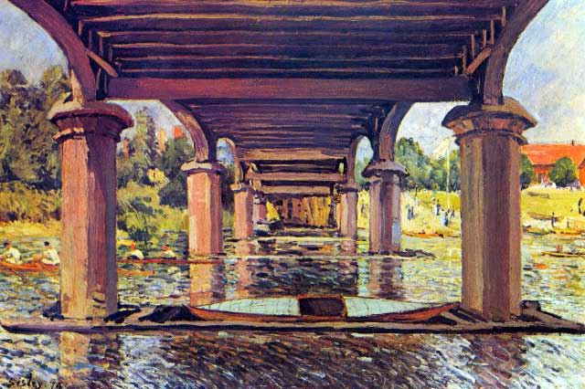 Artist: Alfred Sisley - Title: Under the Bridge at Hampton Court - Medium: Fine Art Reproduction Giclee on Canvas - Image Size: Approximately 13.25 inches x 20 inches - Unframed on Unstretched Canvas - Biography: Alfred Sisley was an Impressionist landscape painter who was born and spent most of his life in France, but retained British citizenship. He was the most consistent of the Impressionists in his dedication to painting landscape en plein air.