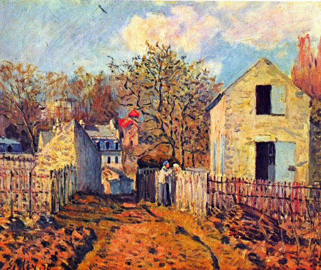 Artist: Alfred Sisley - Title: Village of Voisins (now part of Louveciennes) - Medium: Fine Art Reproduction Giclee on Canvas - Image Size: Approximately 16.75 inches x 20 inches - Unframed on Unstretched Canvas - Biography: Alfred Sisley was an Impressionist landscape painter who was born and spent most of his life in France, but retained British citizenship. He was the most consistent of the Impressionists in his dedication to painting landscape en plein air.