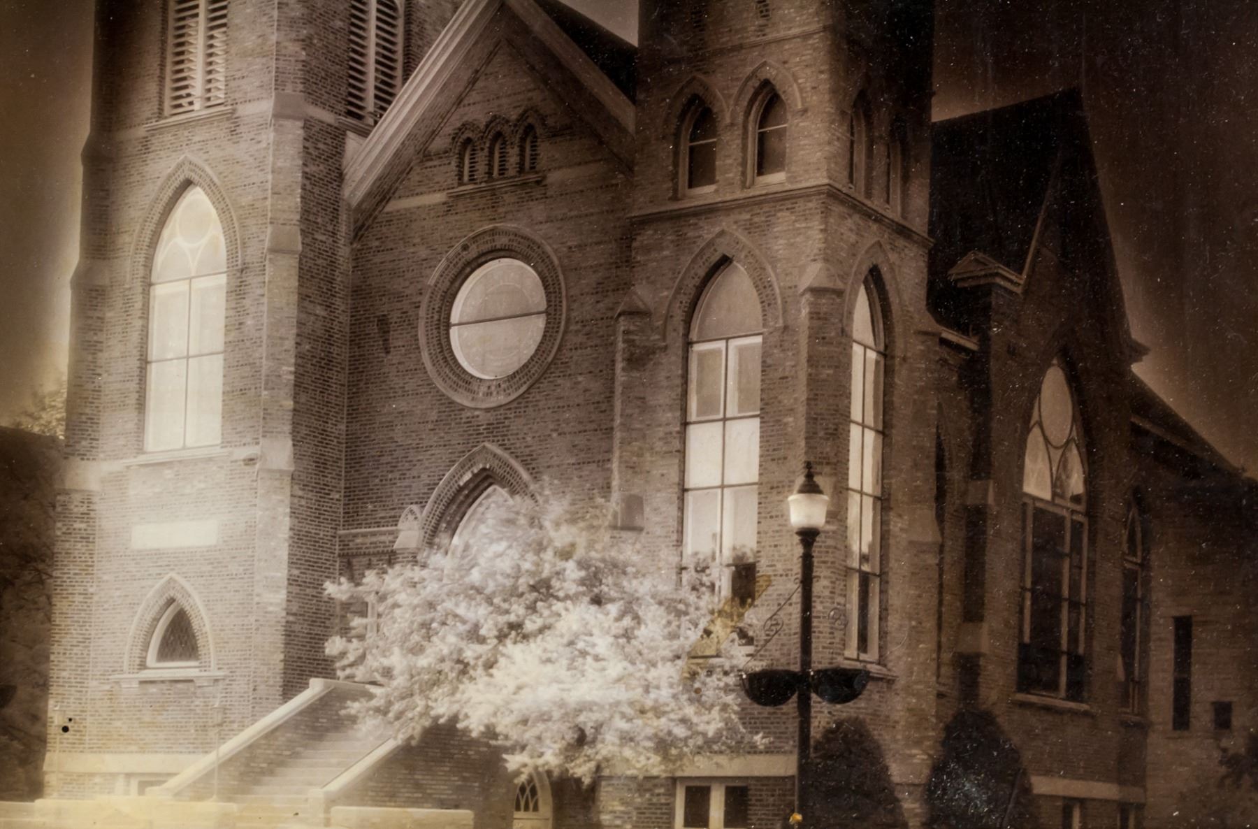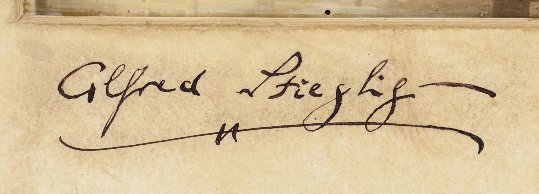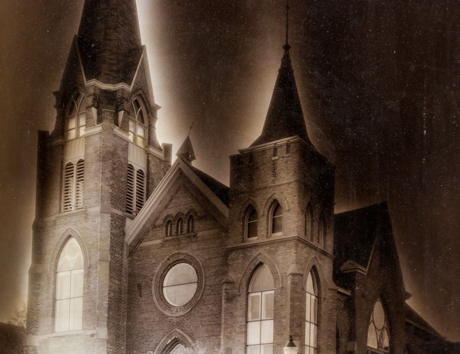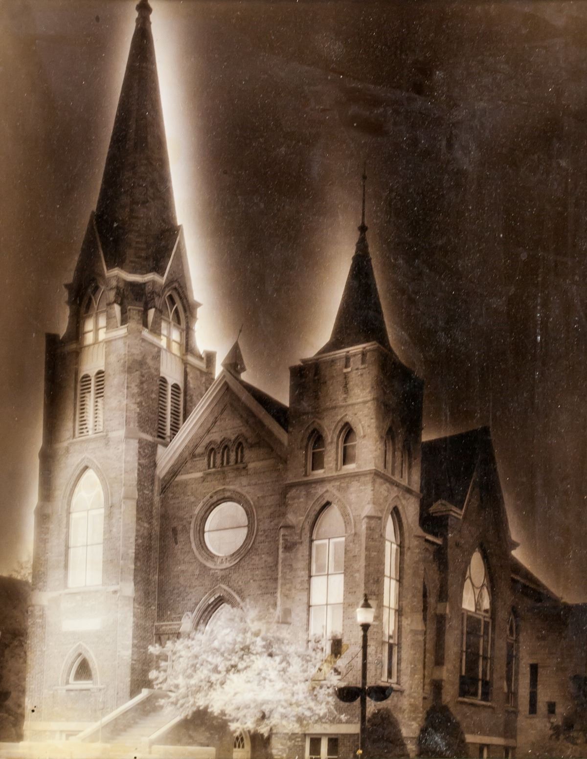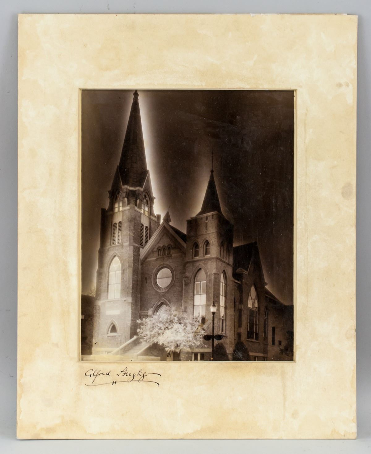 Phtograph of a church. Signed Alfred Stieglitz on the bottom edge. Stamped illegibly on verso. Attributed to Alfred Stieglitz (1864-1946, American). 32 x 26 cm (12.6 x 10.2 inches). Board size: 50.5 x 40.5 cm (19.9 x 15.9 inches)