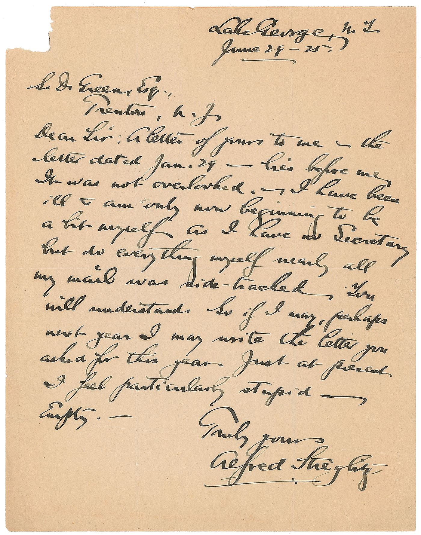 ALS, one page, 8.5 x 10.75, June 29, 1925. Letter to S. D. Green, in full: "A letter of yours to me—the letter dated Jan. 29—lies before me. It was not overlooked.—I have been ill & am only now beginning to be a bit myself as I have no Secretary but do everything myself nearly all my mail was side-tracked. You will understand. So if I may, perhaps next year I may write the letter you asked for this year. Just at present I feel particularly stupid—Empty." In very good to fine condition, with paper loss to the upper left corner, and a diagonal crease across the lower portion of the letter.