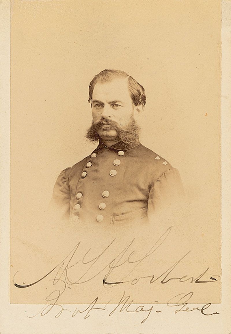 Union general (1833–1880) who commanded a cavalry division under Philip Sheridan. Original 2.5 x 3.5 carte-de-visite bust portrait of Torbert in uniform, signed at the bottom of the image in black ink, “A. T. A. Torbert, Bvt. Maj. Genl.” Published by Wenderoth, Taylor & Brown of Philadelphia. In fine condition, with a trimmed top edge.